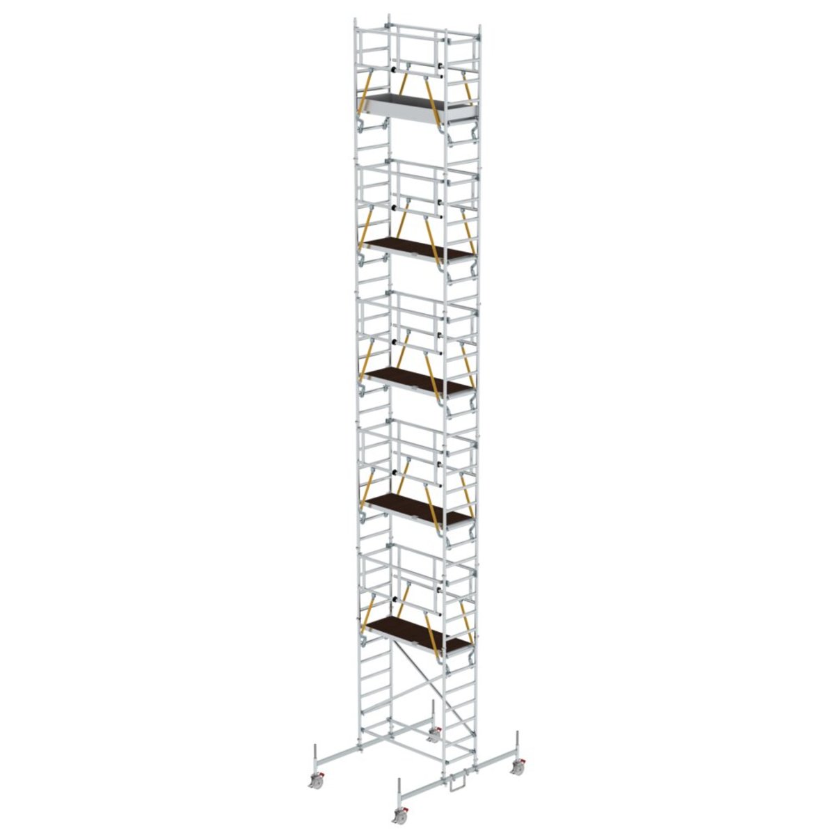 Rollgerüst aus stabilem Aluminium-Rundrohr mit geschweißten Rahmenteilen Dank vorlaufenden Geländern rundum gesichert, von Ebene zu Ebene auf- und abbaubar Alle Gerüstteile sind auch einzeln als Ersatz- oder Erweiterungsteile erhältlich Vier Lenkrollen Ø 200 mm mit zentrischer Lasteinleitung, Feststellern und Spindeln Aluminium-Bordbretter und Geländerrahmen mit integrierter Knieleiste zur Absturzsicherung Werkzeugloser Auf- und Abbau dank Steckverbindungen und Schnellverschlüssen Geringes Gewicht der Einzelteile für ein einfaches Handling Unterschiedliche Plattformlängen erhältlich (1,80 / 2,45 / 3,0 m) Arbeitshöhen bis 12,54 m GS-geprüft nach DIN EN 1004 Lastklasse/Gerüstgruppe 3: 2,0 kN/m²Informationen zu Nachhaltigkeitskriterien Unternehmenszertifizierung: ISO 9001 Unternehmenszertifizierung: EN 1090 Unternehmenszertifizierung: EcoVadis RoHS REACH Die MUNK Group arbeitet mit eine…
