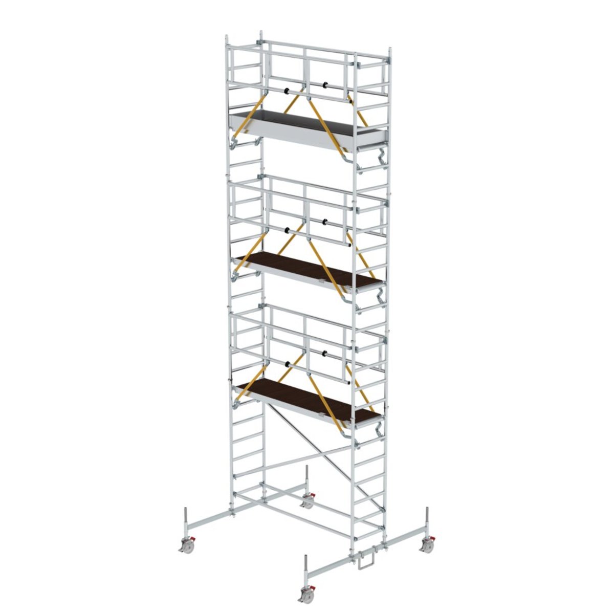 Rollgerüst aus stabilem Aluminium-Rundrohr mit geschweißten Rahmenteilen Dank vorlaufenden Geländern rundum gesichert, von Ebene zu Ebene auf- und abbaubar Alle Gerüstteile sind auch einzeln als Ersatz- oder Erweiterungsteile erhältlich Vier Lenkrollen Ø 200 mm mit zentrischer Lasteinleitung, Feststellern und Spindeln Aluminium-Bordbretter und Geländerrahmen mit integrierter Knieleiste zur Absturzsicherung Werkzeugloser Auf- und Abbau dank Steckverbindungen und Schnellverschlüssen Geringes Gewicht der Einzelteile für ein einfaches Handling Unterschiedliche Plattformlängen erhältlich (1,80 / 2,45 / 3,0 m) Arbeitshöhen bis 12,54 m GS-geprüft nach DIN EN 1004 Lastklasse/Gerüstgruppe 3: 2,0 kN/m²Informationen zu Nachhaltigkeitskriterien Unternehmenszertifizierung: ISO 9001 Unternehmenszertifizierung: EN 1090 Unternehmenszertifizierung: EcoVadis RoHS REACH Die MUNK Group arbeitet mit eine…