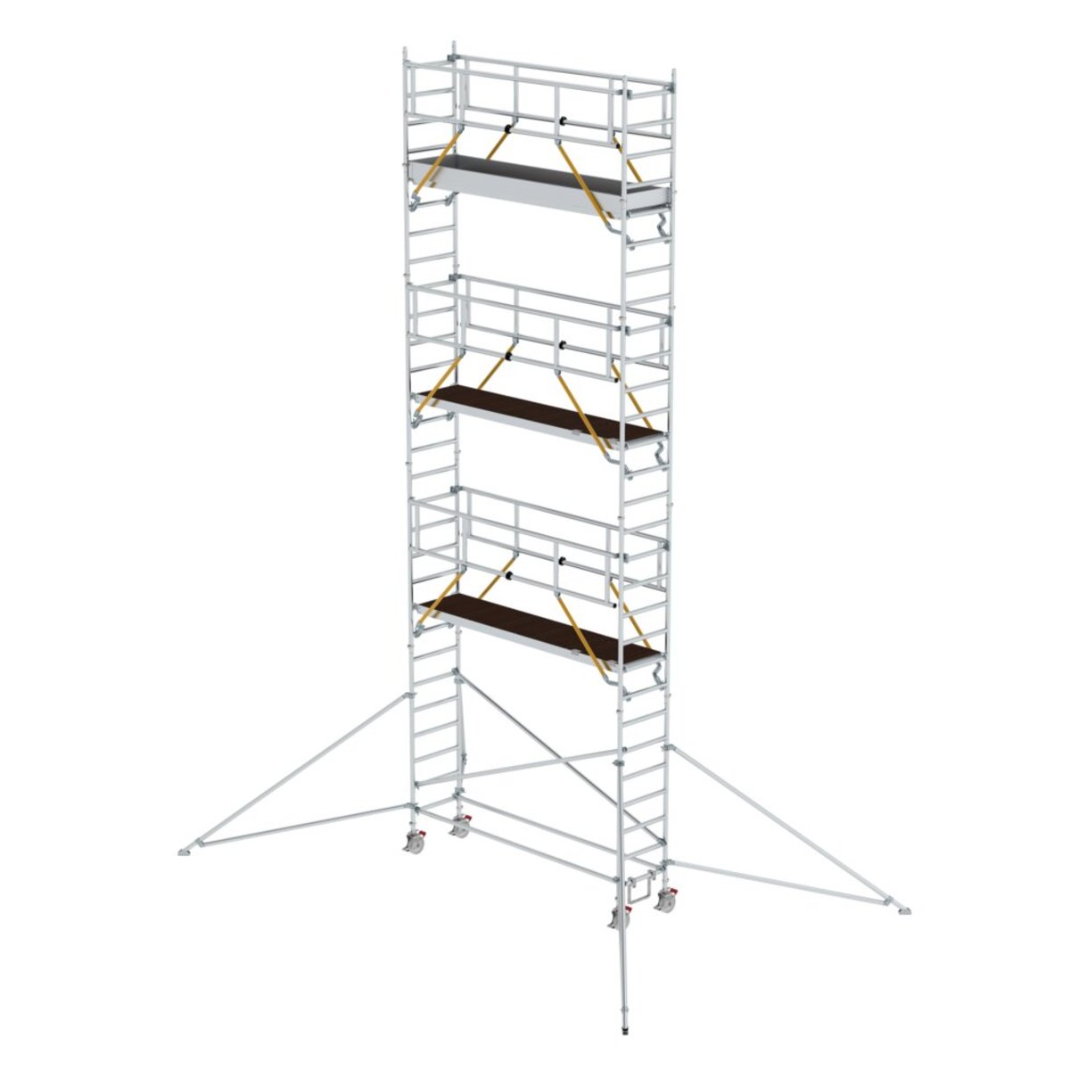 Rollgerüst aus stabilem Aluminium-Rundrohr mit geschweißten Rahmenteilen Dank vorlaufenden Geländern rundum gesichert, von Ebene zu Ebene auf- und abbaubar Alle Gerüstteile sind auch einzeln als Ersatz- oder Erweiterungsteile erhältlich Stabil und flexibel durch klappbare Ausleger Ideal auch für den wandseitigen Aufbau oder das Verfahren in engen Gängen Vier Lenkrollen Ø 200 mm mit zentrischer Lasteinleitung, Feststellern und Spindeln Aluminium-Bordbretter und Geländerrahmen mit integrierter Knieleiste zur Absturzsicherung Werkzeugloser Auf- und Abbau dank Steckverbindungen und Schnellverschlüssen Geringes Gewicht der Einzelteile für ein einfaches Handling Unterschiedliche Plattformlängen erhältlich (1,80 / 2,45 / 3,0 m) Arbeitshöhen bis 12,35 m GS-geprüft nach DIN EN 1004 Lastklasse/Gerüstgruppe 3: 2,0 kN/m²Informationen zu Nachhaltigkeitskriterien Unternehmenszertifizierung: ISO 90…