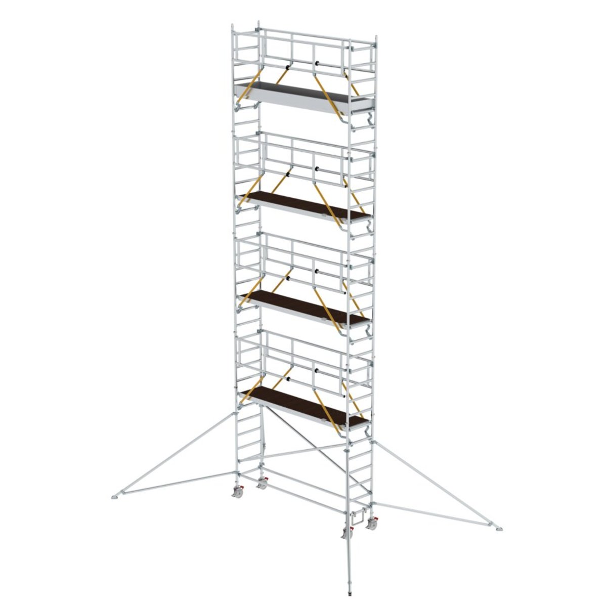 Rollgerüst aus stabilem Aluminium-Rundrohr mit geschweißten Rahmenteilen Dank vorlaufenden Geländern rundum gesichert, von Ebene zu Ebene auf- und abbaubar Alle Gerüstteile sind auch einzeln als Ersatz- oder Erweiterungsteile erhältlich Stabil und flexibel durch klappbare Ausleger Ideal auch für den wandseitigen Aufbau oder das Verfahren in engen Gängen Vier Lenkrollen Ø 200 mm mit zentrischer Lasteinleitung, Feststellern und Spindeln Aluminium-Bordbretter und Geländerrahmen mit integrierter Knieleiste zur Absturzsicherung Werkzeugloser Auf- und Abbau dank Steckverbindungen und Schnellverschlüssen Geringes Gewicht der Einzelteile für ein einfaches Handling Unterschiedliche Plattformlängen erhältlich (1,80 / 2,45 / 3,0 m) Arbeitshöhen bis 12,35 m GS-geprüft nach DIN EN 1004 Lastklasse/Gerüstgruppe 3: 2,0 kN/m²Informationen zu Nachhaltigkeitskriterien Unternehmenszertifizierung: ISO 90…