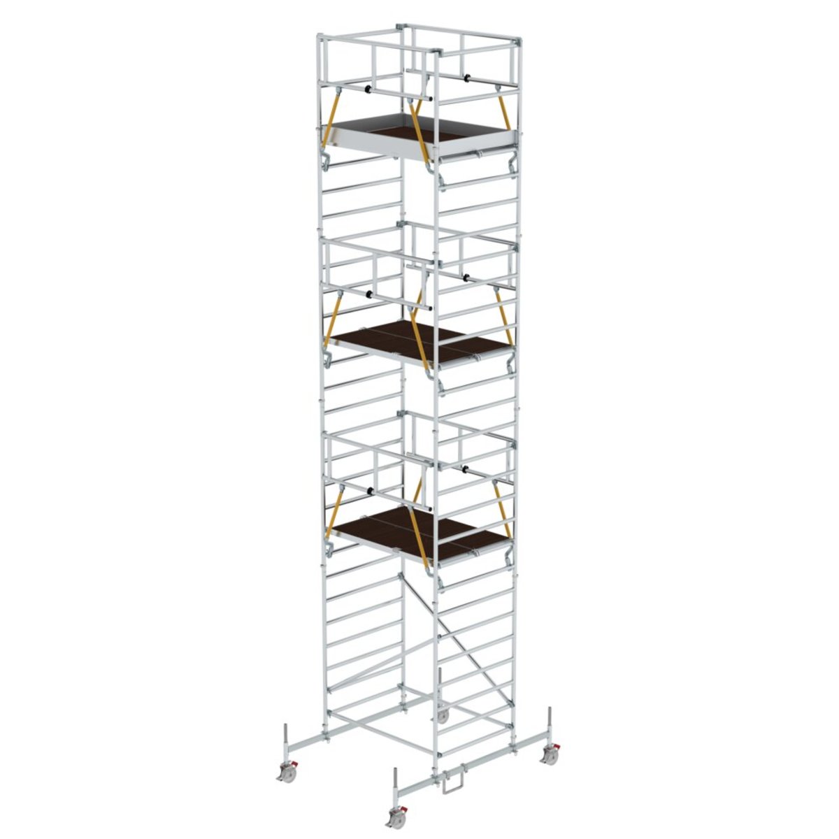 Rollgerüst aus stabilem Aluminium-Rundrohr mit geschweißten Rahmenteilen Dank vorlaufenden Geländern rundum gesichert, von Ebene zu Ebene auf- und abbaubar Großformatige Arbeitsfläche mit 1,35 m Breite Alle Gerüstteile sind auch einzeln als Ersatz- oder Erweiterungsteile erhältlich Vier Lenkrollen Ø 200 mm mit zentrischer Lasteinleitung, Feststellern und Spindeln Aluminium-Bordbretter und Geländerrahmen mit integrierter Knieleiste zur Absturzsicherung Werkzeugloser Auf- und Abbau dank Steckverbindungen und Schnellverschlüssen Geringes Gewicht der Einzelteile für ein einfaches Handling Unterschiedliche Plattformlängen erhältlich (1,80 / 2,45 / 3,0 m) Arbeitshöhen bis 13,62 m GS-geprüft nach DIN EN 1004 Lastklasse/Gerüstgruppe 3: 2,0 kN/m²Informationen zu Nachhaltigkeitskriterien Unternehmenszertifizierung: ISO 9001 Unternehmenszertifizierung: EN 1090 Unternehmenszertifizierung: EcoVad…