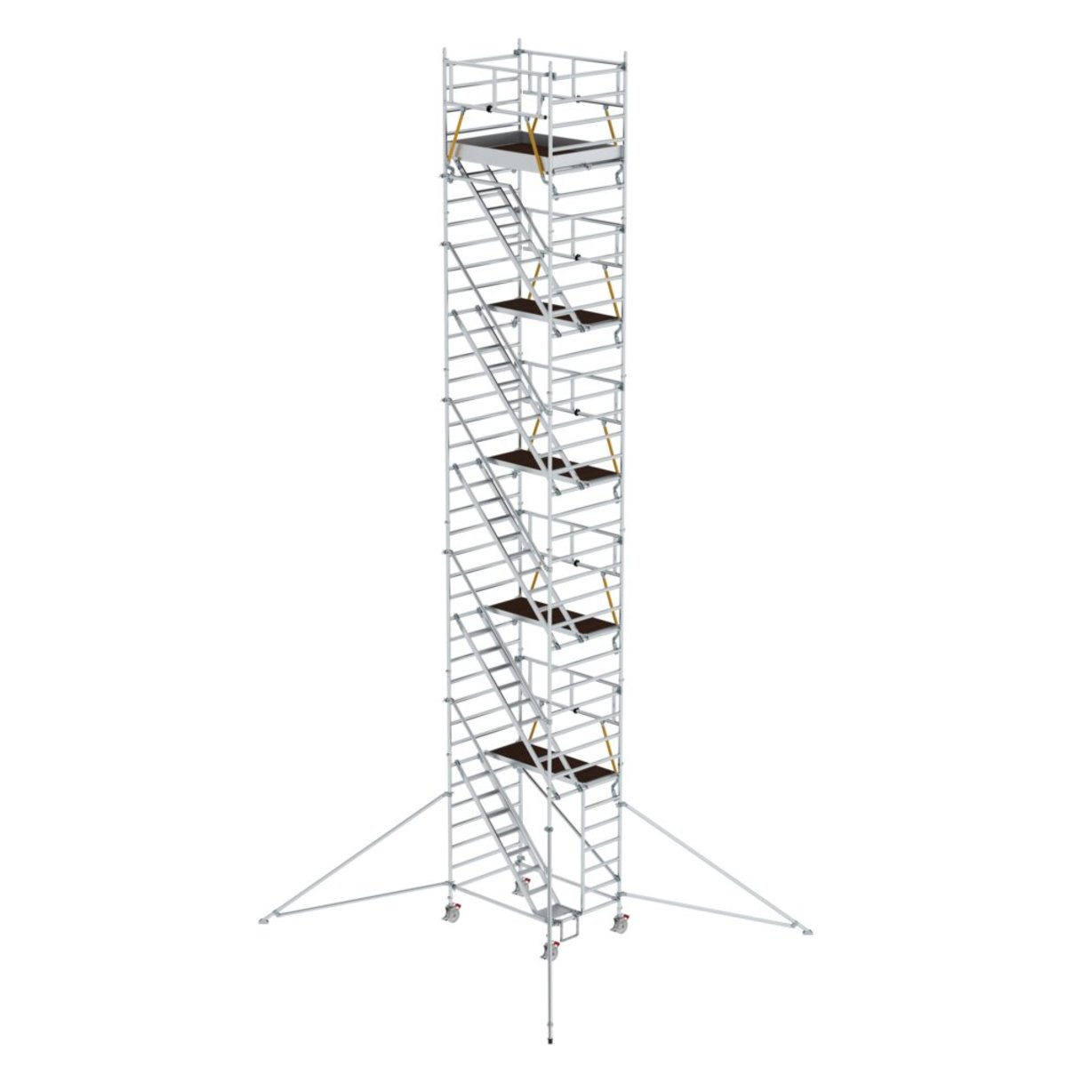 Rollgerüst aus stabilem Aluminium-Rundrohr mit geschweißten Rahmenteilen Dank vorlaufenden Geländern rundum gesichert, von Ebene zu Ebene auf- und abbaubar Schrägaufstiege von Plattform zu Plattform mit 100 mm tiefen, geriffelten Aluminiumstufen und Handlauf für den sicheren Auf- und Abstieg Alle Gerüstteile sind auch einzeln als Ersatz- oder Erweiterungsteile erhältlich Stabil und flexibel durch klappbare Ausleger Ideal auch für den wandseitigen Aufbau oder das Verfahren in engen Gängen Zugang durch Öffnung im Einstiegsrahmen Vier Lenkrollen Ø 200 mm mit zentrischer Lasteinleitung, Feststellern und Spindeln Großformatige Arbeitsfläche mit 1,35 m Breite Aluminium-Bordbretter und Geländerrahmen mit integrierter Knieleiste zur Absturzsicherung Werkzeugloser Auf- und Abbau von Plattform zu Plattform dank Steckverbindungen und Schnellverschlüssen Geringes Gewicht der Einzelteile für ein …