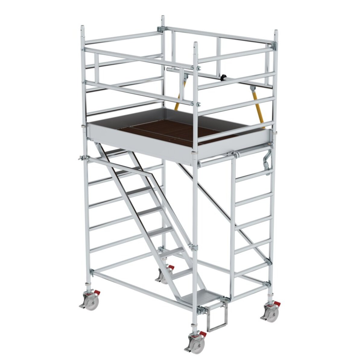 Rollgerüst aus stabilem Aluminium-Rundrohr mit geschweißten Rahmenteilen Dank vorlaufenden Geländern rundum gesichert, von Ebene zu Ebene auf- und abbaubar Schrägaufstiege von Plattform zu Plattform mit 100 mm tiefen, geriffelten Aluminiumstufen und Handlauf für den sicheren Auf- und Abstieg Alle Gerüstteile sind auch einzeln als Ersatz- oder Erweiterungsteile erhältlich Ideal auch für den wandseitigen Aufbau oder das Verfahren in engen Gängen Zugang durch Öffnung im Einstiegsrahmen Vier Lenkrollen Ø 200 mm mit zentrischer Lasteinleitung, Feststellern und Spindeln Großformatige Arbeitsfläche mit 1,35 m Breite Aluminium-Bordbretter und Geländerrahmen mit integrierter Knieleiste zur Absturzsicherung Werkzeugloser Auf- und Abbau von Plattform zu Plattform dank Steckverbindungen und Schnellverschlüssen Geringes Gewicht der Einzelteile für ein einfaches Handling Unterschiedliche Plattform…