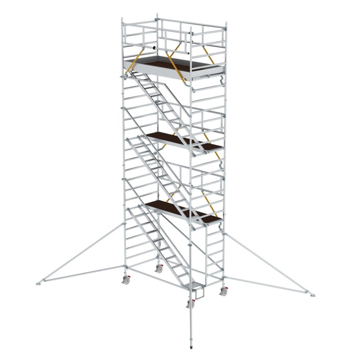 Rollgerüst aus stabilem Aluminium-Rundrohr mit geschweißten Rahmenteilen Dank vorlaufenden Geländern rundum gesichert, von Ebene zu Ebene auf- und abbaubar Schrägaufstiege von Plattform zu Plattform mit 100 mm tiefen, geriffelten Aluminiumstufen und Handlauf für den sicheren Auf- und Abstieg Alle Gerüstteile sind auch einzeln als Ersatz- oder Erweiterungsteile erhältlich Stabil und flexibel durch klappbare Ausleger Ideal auch für den wandseitigen Aufbau oder das Verfahren in engen Gängen Zugang durch Öffnung im Einstiegsrahmen Vier Lenkrollen Ø 200 mm mit zentrischer Lasteinleitung, Feststellern und Spindeln Großformatige Arbeitsfläche mit 1,35 m Breite Aluminium-Bordbretter und Geländerrahmen mit integrierter Knieleiste zur Absturzsicherung Werkzeugloser Auf- und Abbau von Plattform zu Plattform dank Steckverbindungen und Schnellverschlüssen Geringes Gewicht der Einzelteile für ein …