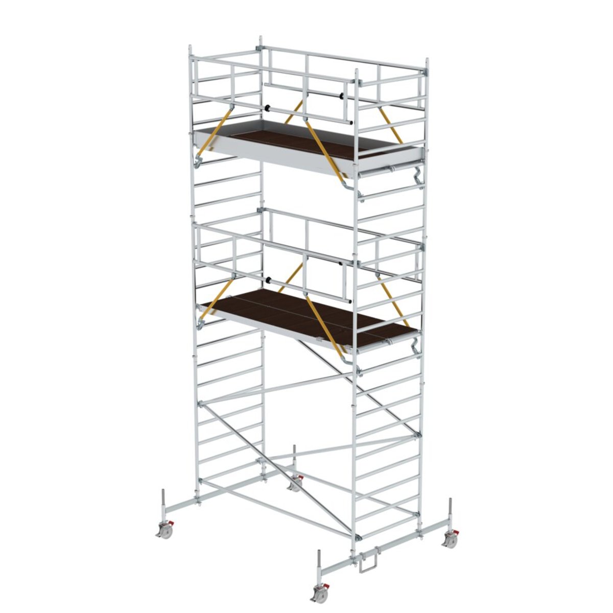 Rollgerüst aus stabilem Aluminium-Rundrohr mit geschweißten Rahmenteilen Dank vorlaufenden Geländern rundum gesichert, von Ebene zu Ebene auf- und abbaubar Großformatige Arbeitsfläche mit 1,35 m Breite Alle Gerüstteile sind auch einzeln als Ersatz- oder Erweiterungsteile erhältlich Vier Lenkrollen Ø 200 mm mit zentrischer Lasteinleitung, Feststellern und Spindeln Aluminium-Bordbretter und Geländerrahmen mit integrierter Knieleiste zur Absturzsicherung Werkzeugloser Auf- und Abbau dank Steckverbindungen und Schnellverschlüssen Geringes Gewicht der Einzelteile für ein einfaches Handling Unterschiedliche Plattformlängen erhältlich (1,80 / 2,45 / 3,0 m) Arbeitshöhen bis 13,62 m GS-geprüft nach DIN EN 1004 Lastklasse/Gerüstgruppe 3: 2,0 kN/m²Informationen zu Nachhaltigkeitskriterien Unternehmenszertifizierung: ISO 9001 Unternehmenszertifizierung: EN 1090 Unternehmenszertifizierung: EcoVad…