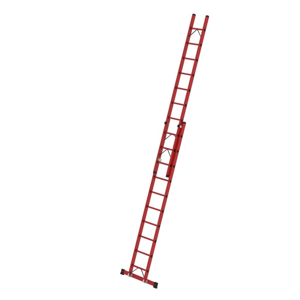 Sprossen-Schiebeleiter aus GFK Holme aus glasfaserverstärkten Rechteckrohr-Profilen (mind. 10 Jahre Alterungsbeständigkeit) Beidseitig geriffelte Vierkantsprossen 28 x 29 mm Durch Verwendung des Einhängetritte aus Metall reduziert sich die Isolationsspannung auf 1.000 V Hochfeste Sprossen-/Holmverbindung Beschläge Stahl verzinkt Einfache Höhenverstellung von Sprosse zu Sprosse Oberleiter ab Größe 2 x 12 mit Wandlaufrollen Korrosionsbeständige Führungsbeschläge Oberleitern bis 3,0 m mit nivello® Leiterschuhen Sprossenabstand: 280 mm Leiterbreite: 420 mm (ohne Traverse) Maximale Belastung: 150 kg Standard-Traverse mit rutschsicheren Leiterschuhen in optimaler Breite zum gewählten Produkt für einen sicheren Stand und Aufstieg bei Anlegeleitern über 3,0 m. Die Traverse liegt lose bei und wird zweifach am unteren Holmende verschraubt Geeignet für das Arbeiten in der Nähe von oder an unte…