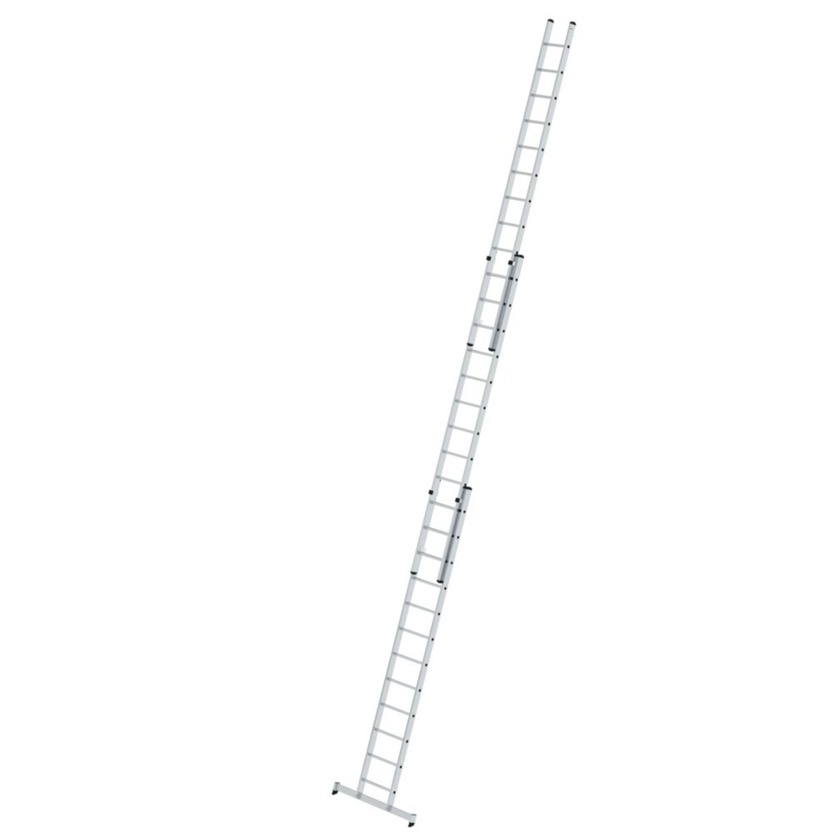 Sprossen-Schiebeleiter aus Aluminium Stabile Rechteckrohr-Holme Beidseitig geriffelte Vierkantsprossen 30 x 30 mm 4-fach gebördelte Sprossen-/Holmverbindung Einfache Höhenverstellung von Sprosse zu Sprosse dank Steckhaken mit automatisch einrastender Abhebesicherung Oberleiter ab Größe 2 x 14 Sprossen mit Wandlaufrollen Korrosionsbeständige Führungsbeschläge Mittel- und Oberleitern bis 3,0 m mit nivello® Leiterschuhen Sprossenabstand: 280 mm Leiterbreite: 500 mm (ohne Traverse) Maximale Belastung: 150 kg nivello® Traverse in optimaler Breite zum gewählten Produkt für einen extra sicheren Stand und Aufstieg dank nivello® Leiterschuhe mit 2-Achsen-Neigungstechnik, Anstellwinkel-Kontrolle und wechselbaren Fußplatten. Die Traverse liegt lose bei und wird zweifach am unteren Holmende verschraubt Hinweis: Nach Norm ist das aufgesetzte Schiebeleiterteil bei Längen über 3,0 m nicht von der L…