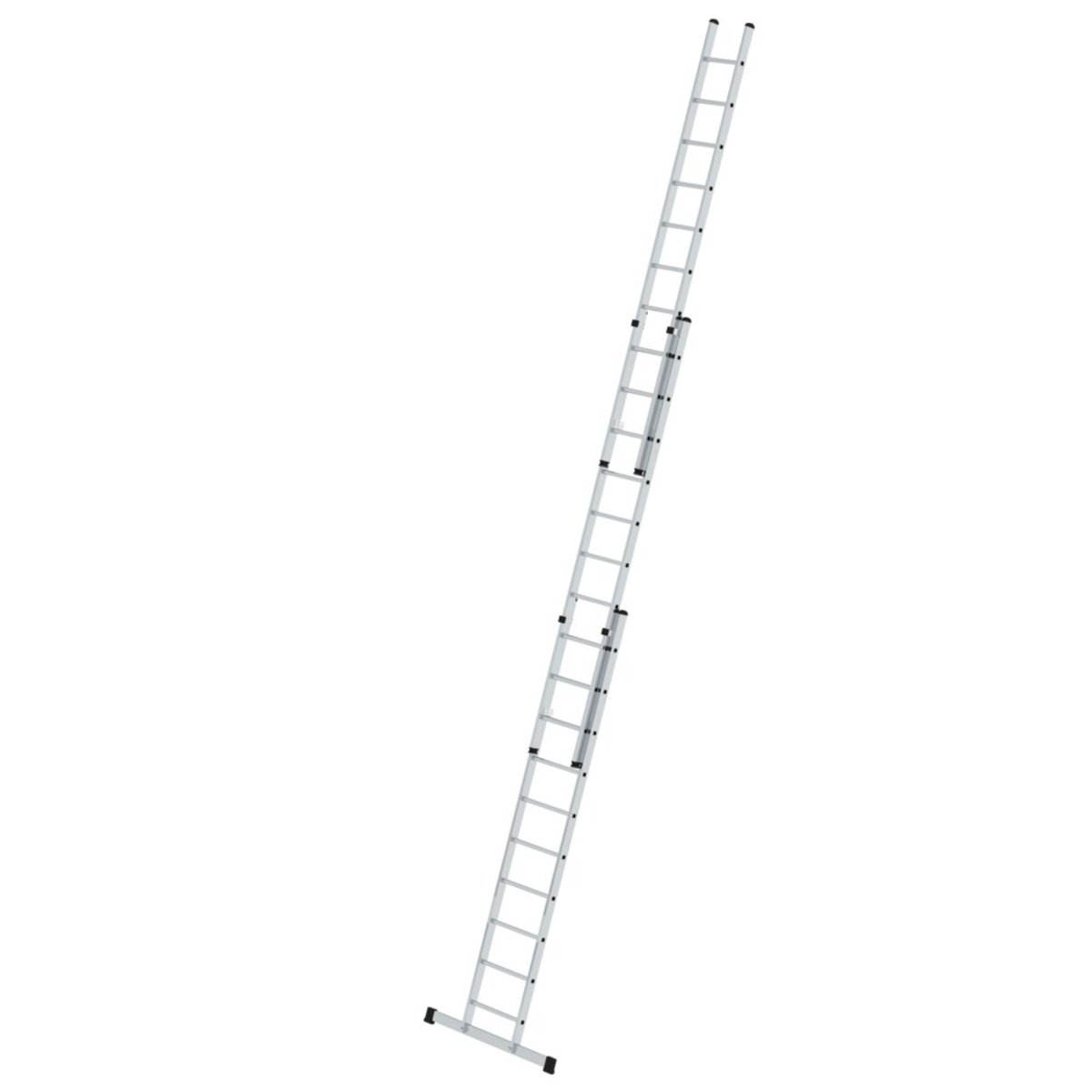 Sprossen-Schiebeleiter aus Aluminium Stabile Rechteckrohr-Holme Beidseitig geriffelte Vierkantsprossen 30 x 30 mm 4-fach gebördelte Sprossen-/Holmverbindung Einfache Höhenverstellung von Sprosse zu Sprosse dank Steckhaken mit automatisch einrastender Abhebesicherung Oberleiter ab Größe 2 x 14 Sprossen mit Wandlaufrollen Korrosionsbeständige Führungsbeschläge Mittel- und Oberleitern bis 3,0 m mit nivello® Leiterschuhen Sprossenabstand: 280 mm Leiterbreite: 500 mm (ohne Traverse) Maximale Belastung: 150 kg Standard-Traverse mit rutschsicheren Leiterschuhen in optimaler Breite zum gewählten Produkt für einen sicheren Stand und Aufstieg bei Anlegeleitern über 3,0 m. Die Traverse liegt lose bei und wird zweifach am unteren Holmende verschraubt Hinweis: Nach Norm ist das aufgesetzte Schiebeleiterteil bei Längen über 3,0 m nicht von der Leiter trennbarInformationen zu Nachhaltigkeitskriteri…