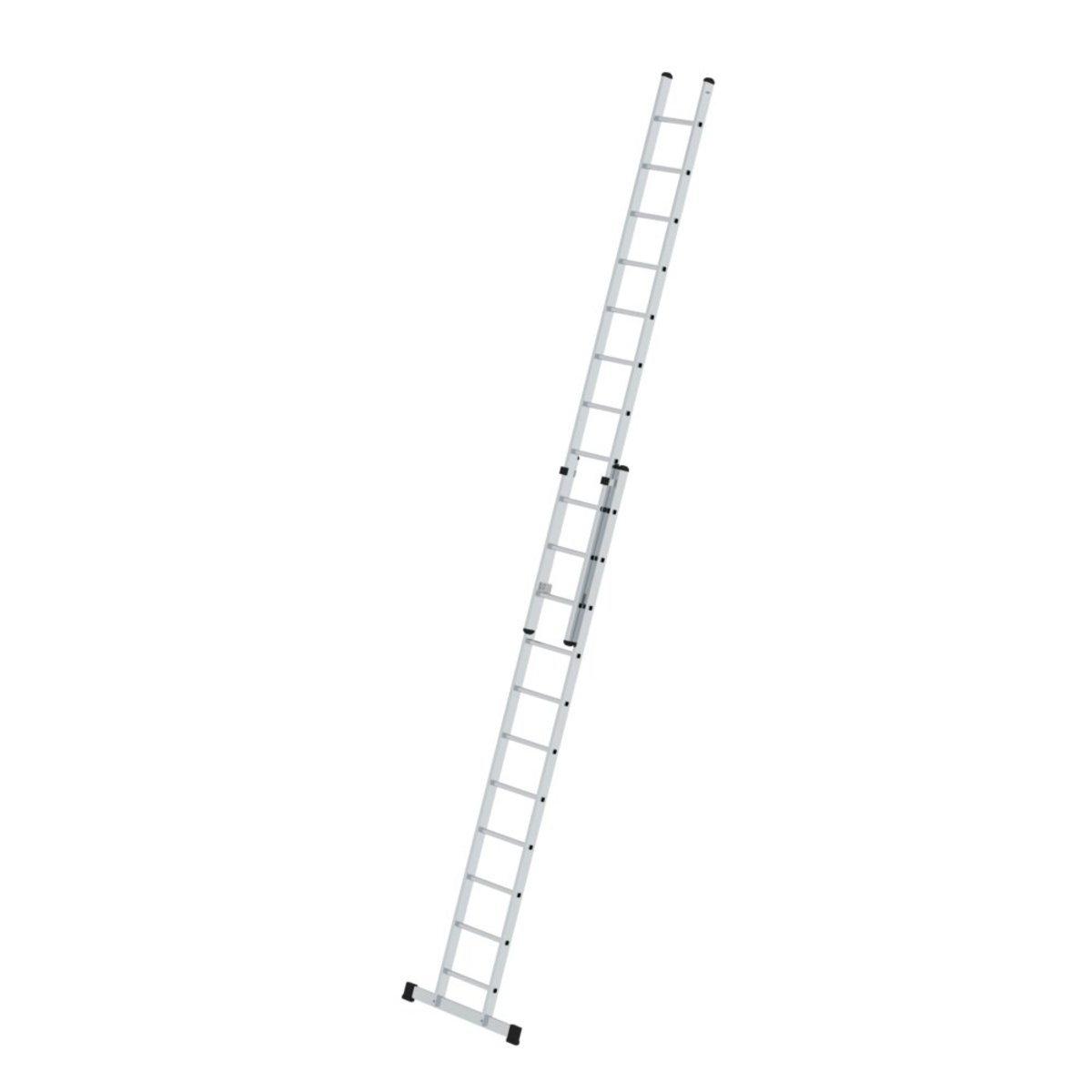 Sprossen-Schiebeleiter aus Aluminium Stabile Rechteckrohr-Holme Beidseitig geriffelte Vierkantsprossen 30 x 30 mm 4-fach gebördelte Sprossen-/Holmverbindung Einfache Höhenverstellung von Sprosse zu Sprosse dank Steckhaken mit automatisch einrastender Abhebesicherung Oberleiter ab Größe 2 x 14 Sprossen mit Wandlaufrollen Korrosionsbeständige Führungsbeschläge Oberleitern bis 3,0 m mit nivello® Leiterschuhen Sprossenabstand: 280 mm Leiterbreite: 420 mm (ohne Traverse) Maximale Belastung: 150 kg Standard-Traverse mit rutschsicheren Leiterschuhen in optimaler Breite zum gewählten Produkt für einen sicheren Stand und Aufstieg bei Anlegeleitern über 3,0 m. Die Traverse liegt lose bei und wird zweifach am unteren Holmende verschraubt Hinweis: Nach Norm ist das aufgesetzte Schiebeleiterteil bei Längen über 3,0 m nicht von der Leiter trennbar