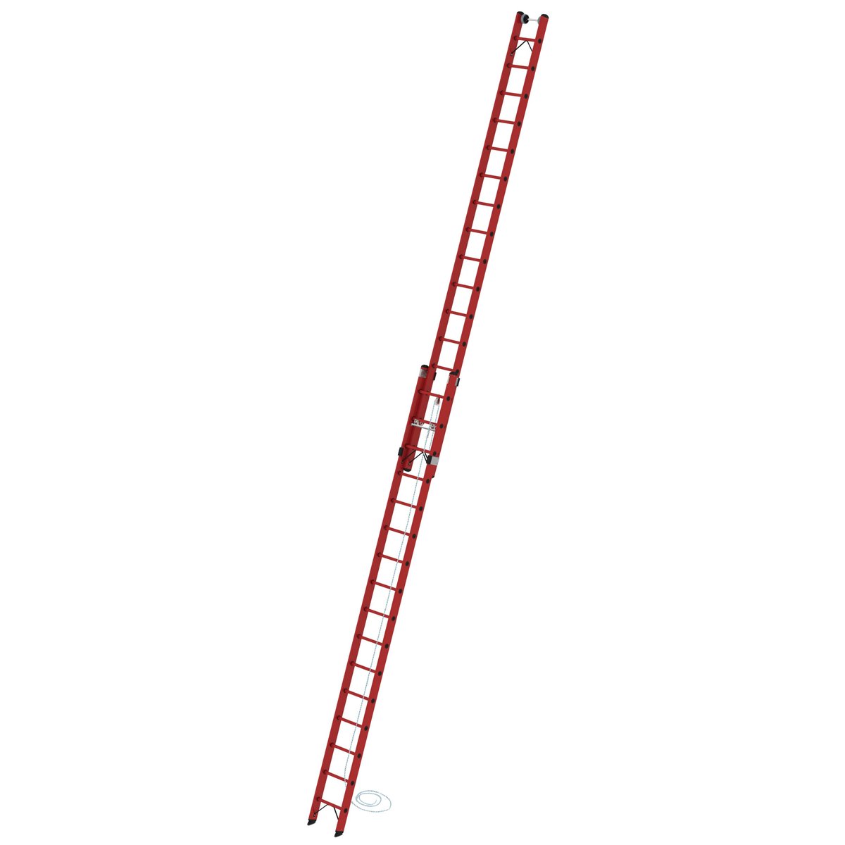 Sprossen-Seilzugleiter aus GFK Holme und Sprossen aus glasfaserverstärkten Rechteckrohr-Profilen (mind. 10 Jahre Altersbeständigkeit) Beidseitig geriffelte Vierkantsprossen 28 x 29 mm Ohne Füllstoffe Hochfeste Sprossen-/Holmverbindung Beschläge stahl verzinkt Bequeme Höhenverstellung von Sprosse zu Sprosse durch Seilzug mit automatisch wirkenden Einfallhaken Oberleiter mit Wandlaufrollen Korrosionsbeständige Führungsbeschläge Oberleitern bis 3,0 m mit nivello®-Leiterschuhe Sprossenabstand: 280 mm Leiterbreite: 420 mm (ohne Traverse) Mit und ohne Traverse erhältlich Geeignet für das Arbeiten in der Nähe von oder an unter Spannung stehenden Teilen Seilzugleiter geprüft nach DIN EN 131. Die Ausführung berücksichtigt die EN 61478:2002 (1.000 Volt) Hinweis: Nach Norm ist das aufgesetzte Schiebeleiterteil bei Längen über 3,0 m nicht von der Leiter trennbar Maximale Belastung: 150…