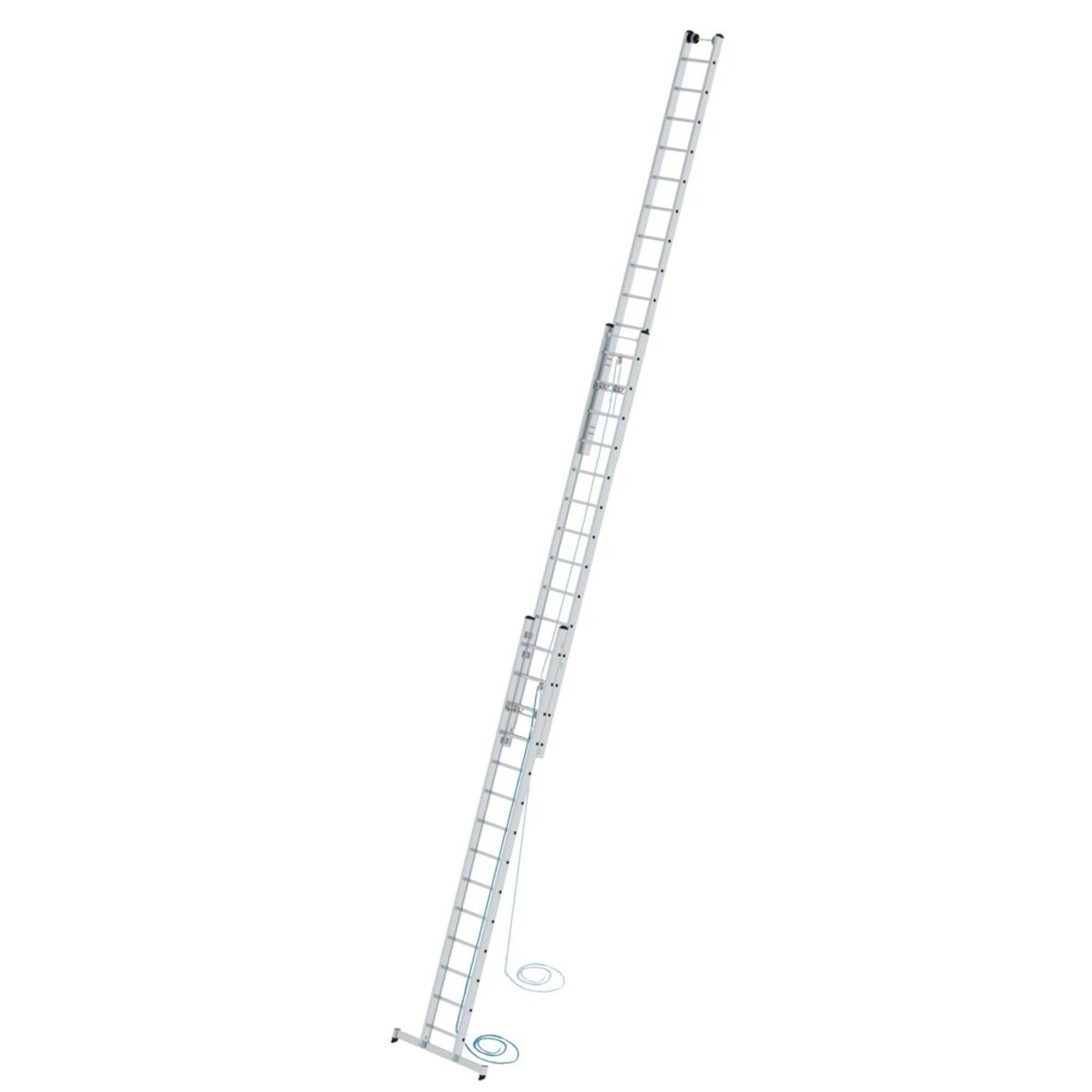 Sprossen-Seilzugleiter aus Aluminium Stabile Rechteckrohr-Holme Beidseitig geriffelte Vierkantsprossen 30 x 30 mm 4-fach gebördelte Sprossen-/Holmverbindung Bequeme Höhenverstellung von Sprosse zu Sprosse dank zwei Seilzügen mit Kunststoffseil Automatisch wirkende Einfallhaken, Mittel- und Oberteil separat verstellbar Oberleiter mit Wandlaufrollen Korrosionsbeständige Führungsbeschläge mit Gleitführungen Sprossenabstand: 280 mm Leiterbreite: 470 mm (ohne Traverse) Maximale Belastung: 150 kg nivello® Traverse in optimaler Breite zum gewählten Produkt für einen extra sicheren Stand und Aufstieg dank nivello® Leiterschuhe mit 2-Achsen-Neigungstechnik, Anstellwinkel-Kontrolle und wechselbaren Fußplatten. Die Traverse liegt lose bei und wird zweifach am unteren Holmende verschraubt Hinweis: Nach Norm ist das aufgesetzte Schiebeleiterteil bei Längen über 3,0 m nicht von der Leiter trennbar…