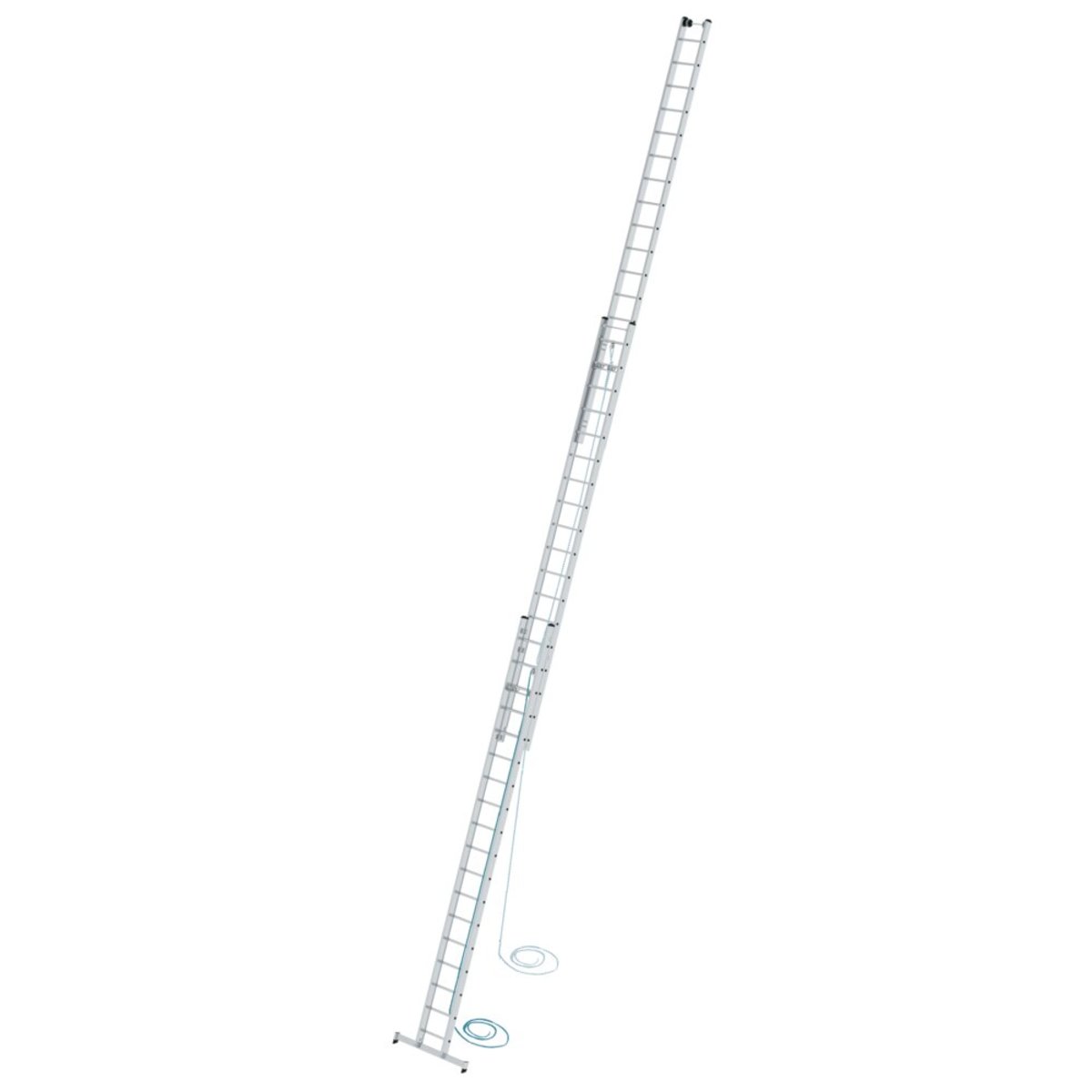 Sprossen-Seilzugleiter aus Aluminium Stabile Rechteckrohr-Holme Beidseitig geriffelte Vierkantsprossen 30 x 30 mm 4-fach gebördelte Sprossen-/Holmverbindung Bequeme Höhenverstellung von Sprosse zu Sprosse dank zwei Seilzügen mit Kunststoffseil Automatisch wirkende Einfallhaken, Mittel- und Oberteil separat verstellbar Oberleiter mit Wandlaufrollen Korrosionsbeständige Führungsbeschläge mit Gleitführungen Sprossenabstand: 280 mm Leiterbreite: 470 mm (ohne Traverse) Maximale Belastung: 150 kg nivello® Traverse in optimaler Breite zum gewählten Produkt für einen extra sicheren Stand und Aufstieg dank nivello® Leiterschuhe mit 2-Achsen-Neigungstechnik, Anstellwinkel-Kontrolle und wechselbaren Fußplatten. Die Traverse liegt lose bei und wird zweifach am unteren Holmende verschraubt Hinweis: Nach Norm ist das aufgesetzte Schiebeleiterteil bei Längen über 3,0 m nicht von der Leiter trennbar…