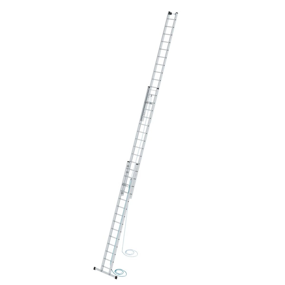 Sprossen-Seilzugleiter aus Aluminium Stabile Rechteckrohr-Holme Beidseitig geriffelte Vierkantsprossen 30 x 30 mm 4-fach gebördelte Sprossen-/Holmverbindung Bequeme Höhenverstellung von Sprosse zu Sprosse dank zwei Seilzügen mit Kunststoffseil Automatisch wirkende Einfallhaken, Mittel- und Oberteil separat verstellbar Oberleiter mit Wandlaufrollen Korrosionsbeständige Führungsbeschläge mit Gleitführungen Sprossenabstand: 280 mm Leiterbreite: 470 mm (ohne Traverse) Maximale Belastung: 150 kg Standard-Traverse mit rutschsicheren Leiterschuhen in optimaler Breite zum gewählten Produkt für einen sicheren Stand und Aufstieg bei Anlegeleitern über 3,0 m. Die Traverse liegt lose bei und wird zweifach am unteren Holmende verschraubt Hinweis: Nach Norm ist das aufgesetzte Schiebeleiterteil bei Längen über 3,0 m nicht von der Leiter trennbarInformationen zu Nachhaltigkeitskriterien Unternehmen…