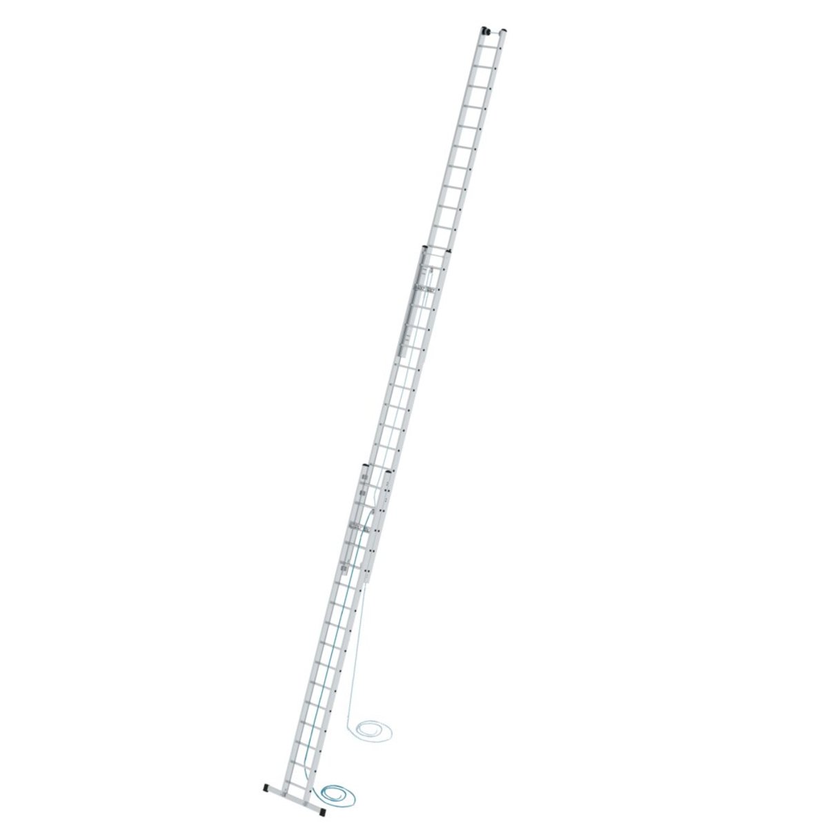 Sprossen-Seilzugleiter aus Aluminium Stabile Rechteckrohr-Holme Beidseitig geriffelte Vierkantsprossen 30 x 30 mm 4-fach gebördelte Sprossen-/Holmverbindung Bequeme Höhenverstellung von Sprosse zu Sprosse dank zwei Seilzügen mit Kunststoffseil Automatisch wirkende Einfallhaken, Mittel- und Oberteil separat verstellbar Oberleiter mit Wandlaufrollen Korrosionsbeständige Führungsbeschläge mit Gleitführungen Sprossenabstand: 280 mm Leiterbreite: 470 mm (ohne Traverse) Maximale Belastung: 150 kg Standard-Traverse mit rutschsicheren Leiterschuhen in optimaler Breite zum gewählten Produkt für einen sicheren Stand und Aufstieg bei Anlegeleitern über 3,0 m. Die Traverse liegt lose bei und wird zweifach am unteren Holmende verschraubt Hinweis: Nach Norm ist das aufgesetzte Schiebeleiterteil bei Längen über 3,0 m nicht von der Leiter trennbarInformationen zu Nachhaltigkeitskriterien Unternehmen…