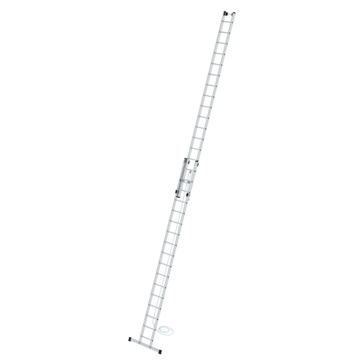 Sprossen-Seilzugleiter aus Aluminium Stabile Rechteckrohr-Holme Beidseitig geriffelte Vierkantsprossen 30 x 30 mm 4-fach gebördelte Sprossen-/Holmverbindung Bequeme Höhenverstellung von Sprosse zu Sprosse dank zwei Seilzügen mit Kunststoffseil Oberleiter mit Wandlaufrollen Korrosionsbeständige Führungsbeschläge mit Gleitführungen Sprossenabstand: 280 mm Maximale Belastung: 150 kg Standard-Traverse mit rutschsicheren Leiterschuhen in optimaler Breite zum gewählten Produkt für einen sicheren Stand und Aufstieg bei Anlegeleitern über 3,0 m. Die Traverse liegt lose bei und wird zweifach am unteren Holmende verschraubtInformationen zu Nachhaltigkeitskriterien Unternehmenszertifizierung: ISO 9001 Unternehmenszertifizierung: EN 1090 Unternehmenszertifizierung: EcoVadis RoHS REACH Die MUNK Group arbeitet mit einem Code of Conduct Das Lieferkettengesetz findet aufgrund unserer Größe keine Anw…
