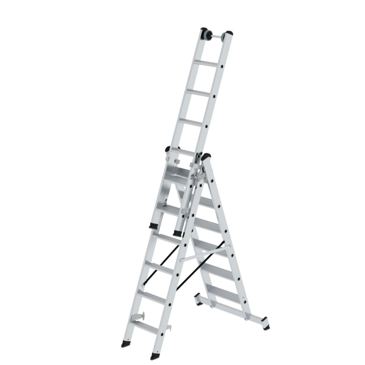 Stufen-Mehrzweckleiter aus Aluminium Stabile Rechteckrohr-Holme 80 mm tiefe, geriffelte Stufen 4-fach gebördelte Stufen-/Holmverbindung nivello® Leiterschuhe und nivello® Traverse (liegt lose bei) Einsetzbar als Steh-, Anlege- und Schiebeleiter Einfache Höhenverstellung und sichere Arretierung dank Steckhaken mit automatisch einrastender Abhebesicherung Oberleiter mit Wandlaufrollen Spreizsicherung mit zwei hochfesten Polyestergurten und lösbarer Metallstrebe Stufenabstand: 263 mm Leiterbreite: 490 mm (ohne Traverse) Leiterneigung: 70° Maximale Belastung: 150 kgInformationen zu Nachhaltigkeitskriterien Unternehmenszertifizierung: ISO 9001 Unternehmenszertifizierung: EN 1090 Unternehmenszertifizierung: EcoVadis RoHS REACH Die MUNK Group arbeitet mit einem Code of Conduct Das Lieferkettengesetz findet aufgrund unserer Größe keine Anwendung Die verwendeten Materialien sind der technisch…