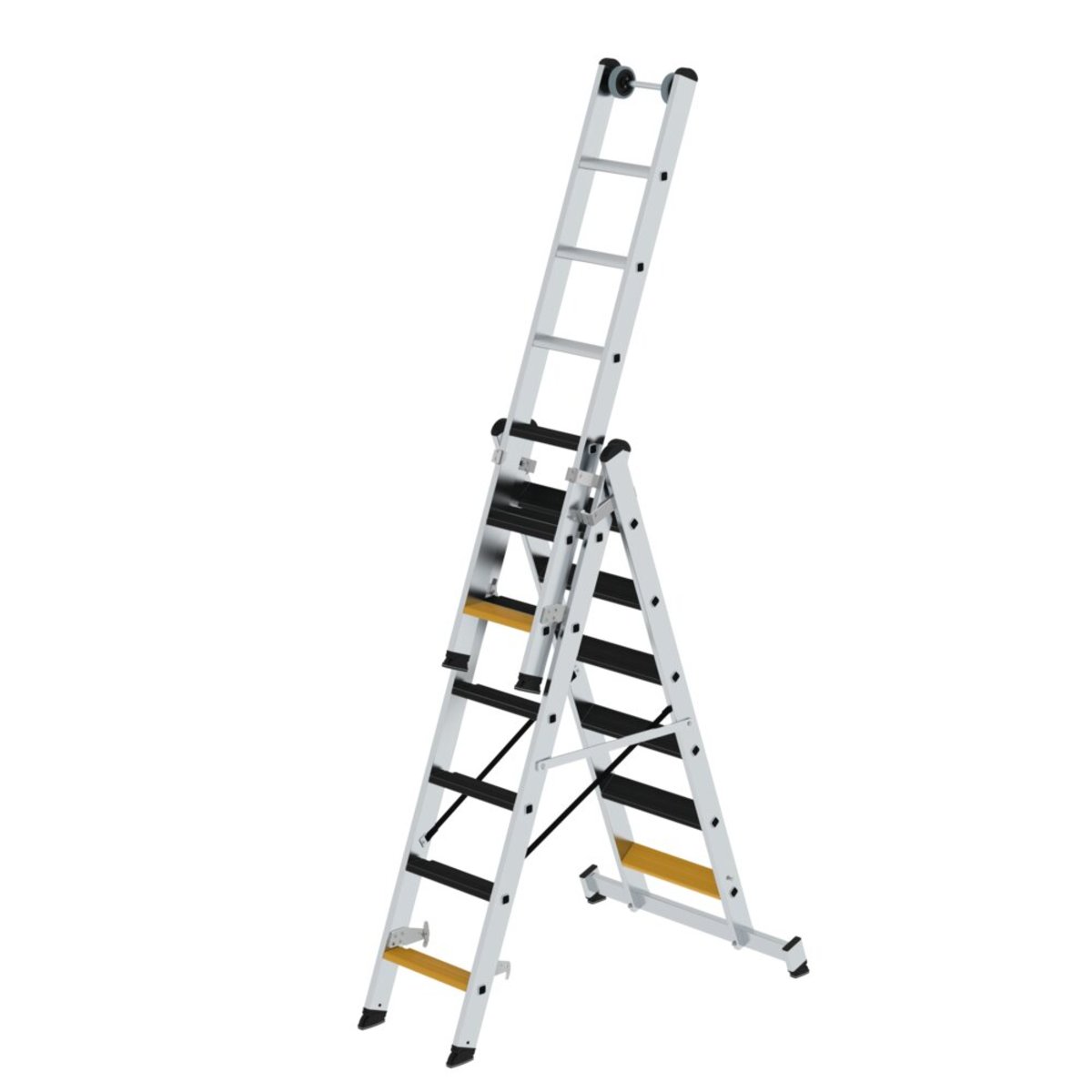 Stufen-Mehrzweckleiter aus Aluminium Stabile Rechteckrohr-Holme 80 mm tiefe, geriffelte Stufen 4-fach gebördelte Stufen-/Holmverbindung nivello® Leiterschuhe und nivello® Traverse (liegt lose bei) Einsetzbar als Steh-, Anlege- und Schiebeleiter Einfache Höhenverstellung und sichere Arretierung dank Steckhaken mit automatisch einrastender Abhebesicherung Oberleiter mit Wandlaufrollen Spreizsicherung mit zwei hochfesten Polyestergurten und lösbarer Metallstrebe Stufenabstand: 263 mm Leiterbreite: 490 mm (ohne Traverse) Leiterneigung: 70° Maximale Belastung: 150 kg Trittauflagen clip-step R13 für zertifizierte Rutschhemmung Unterste Stufe pro Leiterteil mit clip-step R13 in Gelb ausgeführtInformationen zu Nachhaltigkeitskriterien Unternehmenszertifizierung: ISO 9001 Unternehmenszertifizierung: EN 1090 Unternehmenszertifizierung: EcoVadis RoHS REACH Die MUNK Group arbeitet mit einem Code…
