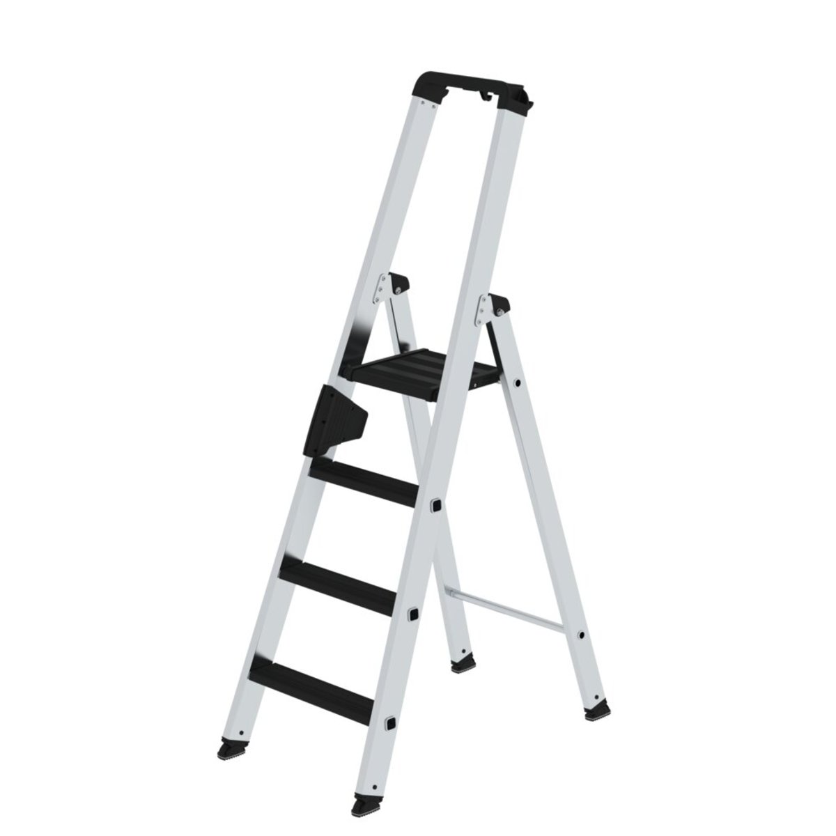 Stufen-Stehleiter aus Aluminium Stabile Rechteckrohr-Holme 80 mm tiefe, geriffelte Stufen und große Plattform Trittauflage clip-step R13 für zertifizierte Rutschhemmung 4-fach gebördelte Stufen-/Holmverbindung Konische Holmführung für einen sicheren Stand nivello® Leiterschuhe mit patentierter 2-Achsen-Neigungstechnik ergo-pad® Griffzone mit Klemmmechanismus Leitergelenk ‘safe-cap’ Praktische Ablageschale mit integrierten Haken und Werkzeugaufnahmen Ab fünf Stufen: Spreizsicherung mit zwei hochfesten Polyestergurten Stufenabstand: 235 mm Leiterneigung: 70° Maximale Belastung: 250 kgInformationen zu Nachhaltigkeitskriterien Unternehmenszertifizierung: ISO 9001 Unternehmenszertifizierung: EN 1090 Unternehmenszertifizierung: EcoVadis RoHS REACH Die MUNK Group arbeitet mit einem Code of Conduct Das Lieferkettengesetz findet aufgrund unserer Größe keine Anwendung Die verwendeten Materiali…