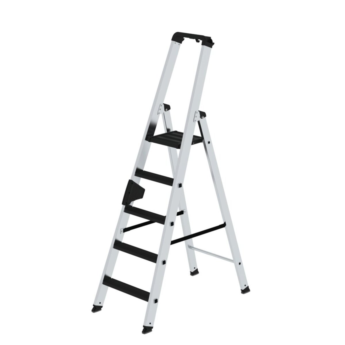 Stufen-Stehleiter aus Aluminium Stabile Rechteckrohr-Holme 80 mm tiefe, geriffelte Stufen und große Plattform Trittauflage clip-step R13 für zertifizierte Rutschhemmung 4-fach gebördelte Stufen-/Holmverbindung Konische Holmführung für einen sicheren Stand nivello® Leiterschuhe mit patentierter 2-Achsen-Neigungstechnik ergo-pad® Griffzone mit Klemmmechanismus Leitergelenk ‘safe-cap’ Praktische Ablageschale mit integrierten Haken und Werkzeugaufnahmen Ab fünf Stufen: Spreizsicherung mit zwei hochfesten Polyestergurten Stufenabstand: 235 mm Leiterneigung: 70° Maximale Belastung: 250 kgInformationen zu Nachhaltigkeitskriterien Unternehmenszertifizierung: ISO 9001 Unternehmenszertifizierung: EN 1090 Unternehmenszertifizierung: EcoVadis RoHS REACH Die MUNK Group arbeitet mit einem Code of Conduct Das Lieferkettengesetz findet aufgrund unserer Größe keine Anwendung Die verwendeten Materiali…
