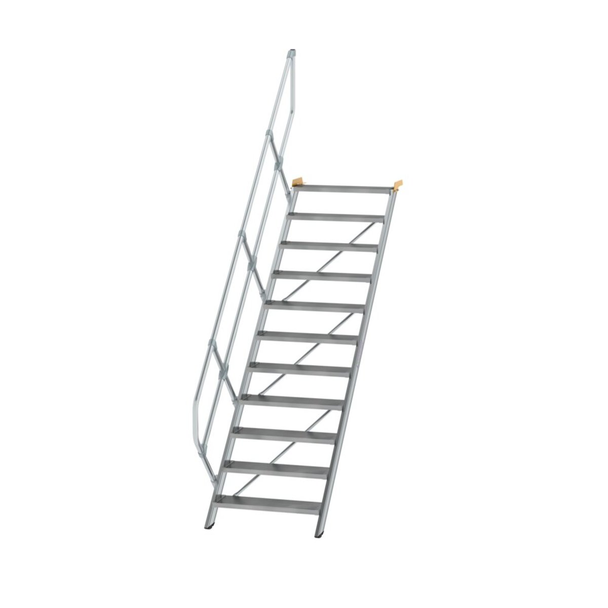 Ortsfeste Treppe aus Aluminium mit Neigung 45° Stufenbreite: 800 mm Stufentiefe: 225 mm Stufenausführung standardmäßig in Aluminium geriffelt (R 9), optional auch mit anderen Belägen erhältlich Handlauf einseitig Ø 40 mm mit verschraubten Verbindungselementen serienmäßig (Höhe: 1.100 mm) Zweiter Handlauf optional (bei Wandabstand >120 mm nach DIN EN ISO 14122-3 erforderlich) Bei Treppen mit Stufenbreite 800 oder 1.000 mm ist ab 3.300 mm senkrechter Höhe eine mittige Abstützung erforderlich (gegen Mehrpreis oder bauseits) Einfache Montage durch Lieferung in vormontierten Baugruppen inklusive Montageanleitung Maximale Belastung: Stufenbelastung 150 kg, Gesamtbelastung 300 kg Hinweis: Im Standard sind Verbindungsteile aus verzinktem Stahl enthalten, welche für den Innenbereich geeignet sind. Gegen Mehrpreis können diese auch in Edelstahl ausgeführt werden, was für den Außenbereich empfo…