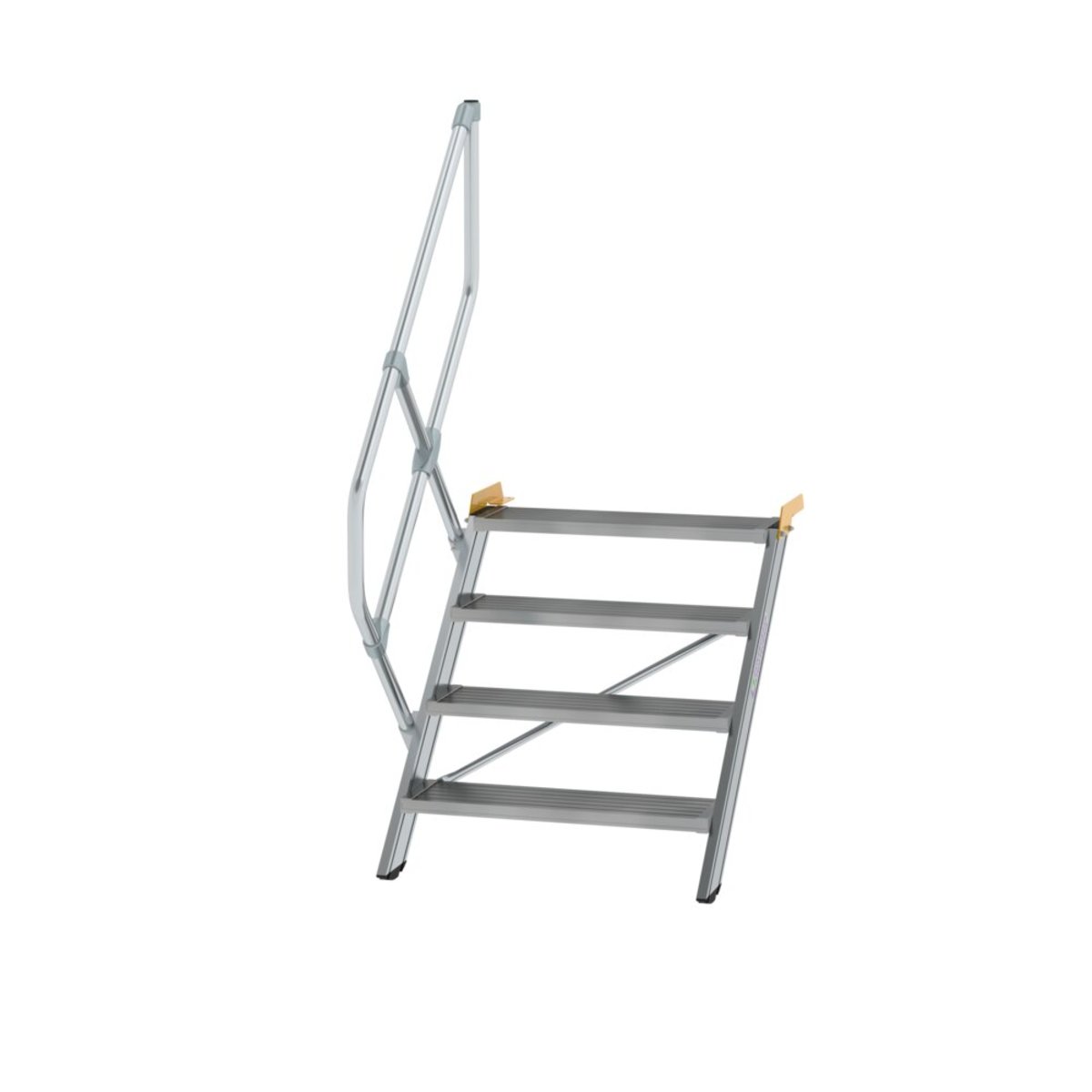 Ortsfeste Treppe aus Aluminium mit Neigung 45° Stufenbreite: 800 mm Stufentiefe: 225 mm Stufenausführung standardmäßig in Aluminium geriffelt (R 9), optional auch mit anderen Belägen erhältlich Handlauf einseitig Ø 40 mm mit verschraubten Verbindungselementen serienmäßig (Höhe: 1.100 mm) Zweiter Handlauf optional (bei Wandabstand >120 mm nach DIN EN ISO 14122-3 erforderlich) Bei Treppen mit Stufenbreite 800 oder 1.000 mm ist ab 3.300 mm senkrechter Höhe eine mittige Abstützung erforderlich (gegen Mehrpreis oder bauseits) Einfache Montage durch Lieferung in vormontierten Baugruppen inklusive Montageanleitung Maximale Belastung: Stufenbelastung 150 kg, Gesamtbelastung 300 kg Hinweis: Im Standard sind Verbindungsteile aus verzinktem Stahl enthalten, welche für den Innenbereich geeignet sind. Gegen Mehrpreis können diese auch in Edelstahl ausgeführt werden, was für den Außenbereich empfo…