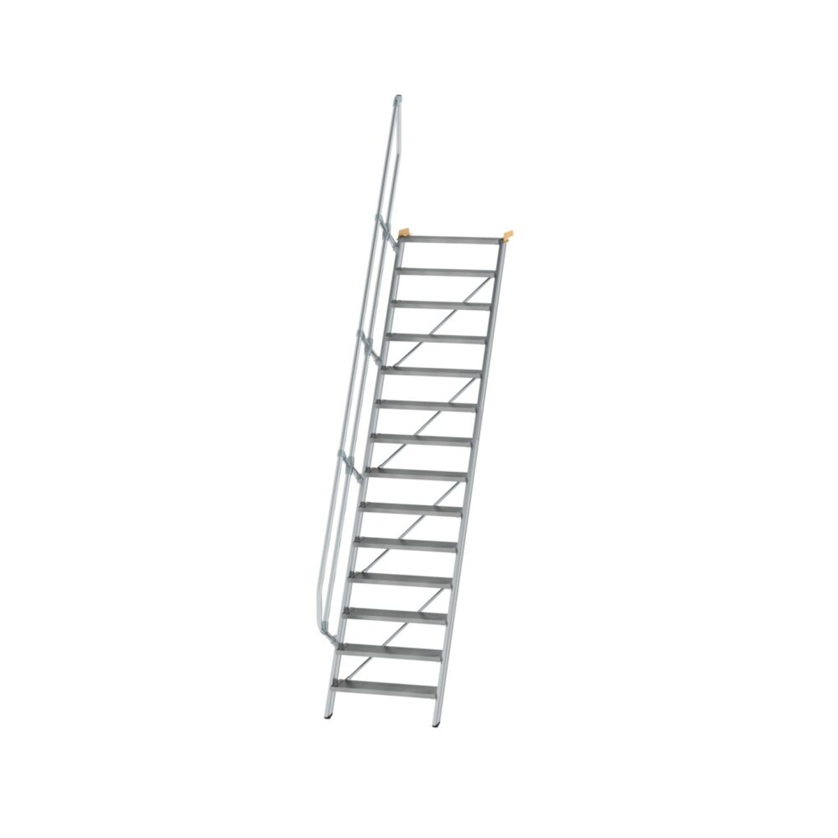 Ortsfeste Treppe aus Aluminium mit Neigung 60° Stufenbreite: 800 mm Stufentiefe: 225 mm Stufenausführung standardmäßig in Aluminium geriffelt (R 9), optional auch mit anderen Belägen erhältlich Handlauf einseitig Ø 40 mm mit verschraubten Verbindungselementen serienmäßig (Höhe: 1.100 mm) Zweiter Handlauf nach DIN EN ISO 14122-3 erforderlich und gegen Mehrpreis erhältlich Bei Treppen mit senkrechter Höhe ab 3.000 mm ist ein Zwischenpodest erforderlich (gegen Mehrpreis) Einfache Montage durch Lieferung in vormontierten Baugruppen inklusive Montageanleitung Maximale Belastung: Stufenbelastung 150 kg, Gesamtbelastung 300 kg Hinweis: Im Standard sind Verbindungsteile aus verzinktem Stahl enthalten, welche für den Innenbereich geeignet sind. Gegen Mehrpreis können diese auch in Edelstahl ausgeführt werden, was für den Außenbereich empfohlen wirdInformationen zu Nachhaltigkeitskriterien Unt…