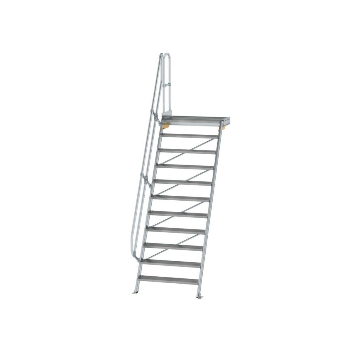 Ortsfeste Treppe mit Plattform aus Aluminium mit Neigung 60° Stufen- und Plattformbreite: 1.000 mm Plattformlänge: 460 mm Letzte Stufe (Tiefe: 225 mm) auf gleicher Höhe wie Plattform montiert (Gesamttrittfläche: 685 mm) Stufen- und Plattformausführung standardmäßig in Aluminium geriffelt (R 9), optional auch mit anderen Belägen erhältlich Handlauf und Geländer einseitig Ø 40 mm mit verschraubten Verbindungselementen (Höhe: 1.100 mm) serienmäßig Zweiter Handlauf nach DIN EN ISO 14122-3 erforderlich und gegen Mehrpreis erhältlich Untere Holmenden mit robusten Fußwinkeln zur Bodenbefestigung Stirnseitiges Geländer gegen Mehrpreis erhältlich Einfache Montage durch Lieferung in vormontierten Baugruppen inklusive Montageanleitung Bei Treppen mit senkrechter Höhe ab 3.000 mm ist ein Zwischenpodest erforderlich (gegen Mehrpreis) Sofern bauseits keine Auflageflächen oder Befestigungen vorhand…