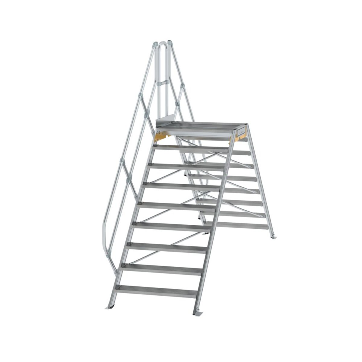 Ortsfester Überstieg aus Aluminium mit Neigung 45° Stufen- und Plattformbreite: 1.000 mm Plattformlänge: 460 mm Letzte Stufen (Tiefe: 225 mm) auf gleicher Höhe wie Plattform montiert (Gesamttrittfläche: 910 mm) Stufen- und Plattformausführung standardmäßig in Aluminium geriffelt (R 9), optional auch mit anderen Belägen erhältlich Handlauf und Geländer einseitig Ø 40 mm mit verschraubten Verbindungselementen (Höhe: 1.100 mm) serienmäßig Zweiter Handlauf optional (bei Wandabstand >120 mm nach DIN EN ISO 14122-3 erforderlich) Untere Holmenden mit robusten Fußwinkeln zur Bodenbefestigung Einfache Montage durch Lieferung in vormontierten Baugruppen inklusive Montageanleitung Maximale Belastung: 1,5 kN/m2, Stufenbelastung 150 kg, Gesamtbelastung 300 kg Hinweis: Im Standard sind Verbindungsteile aus verzinktem Stahl enthalten, welche für den Innenbereich geeignet sind. Gegen Mehrpreis könne…