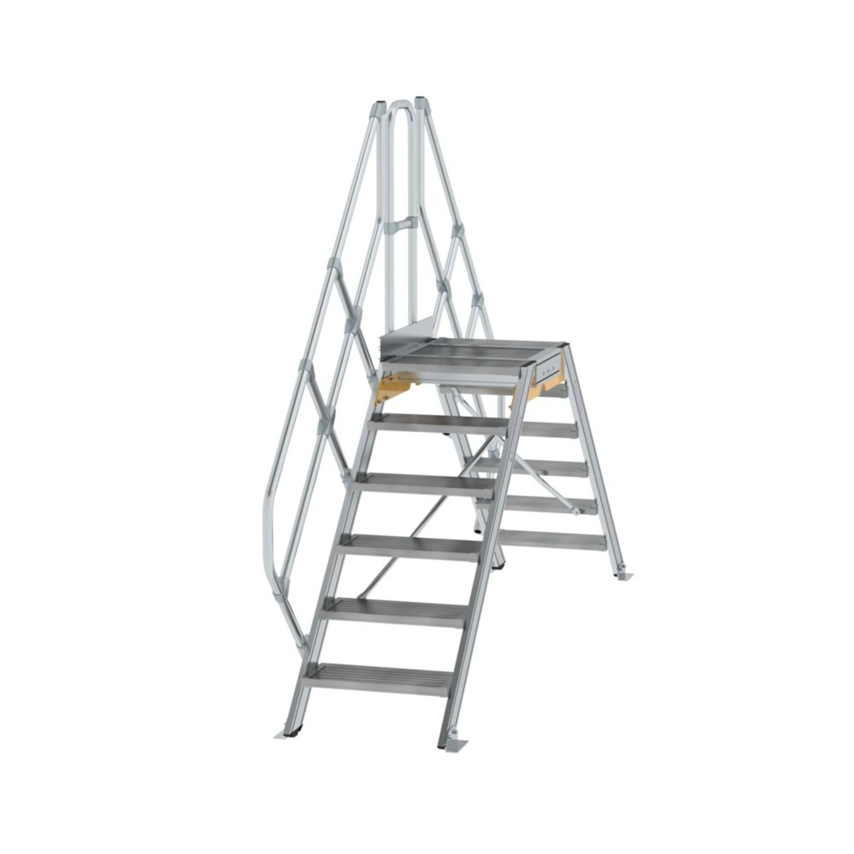 Ortsfester Überstieg aus Aluminium mit Neigung 45° Stufen- und Plattformbreite: 600 mm Plattformlänge: 460 mm Letzte Stufen (Tiefe: 225 mm) auf gleicher Höhe wie Plattform montiert (Gesamttrittfläche: 910 mm) Stufen- und Plattformausführung standardmäßig in Aluminium geriffelt (R 9), optional auch mit anderen Belägen erhältlich Handlauf und Geländer einseitig Ø 40 mm mit verschraubten Verbindungselementen (Höhe: 1.100 mm) serienmäßig Zweiter Handlauf optional (bei Wandabstand >120 mm nach DIN EN ISO 14122-3 erforderlich) Untere Holmenden mit robusten Fußwinkeln zur Bodenbefestigung Einfache Montage durch Lieferung in vormontierten Baugruppen inklusive Montageanleitung Maximale Belastung: 1,5 kN/m2, Stufenbelastung 150 kg, Gesamtbelastung 300 kg Hinweis: Im Standard sind Verbindungsteile aus verzinktem Stahl enthalten, welche für den Innenbereich geeignet sind. Gegen Mehrpreis können …