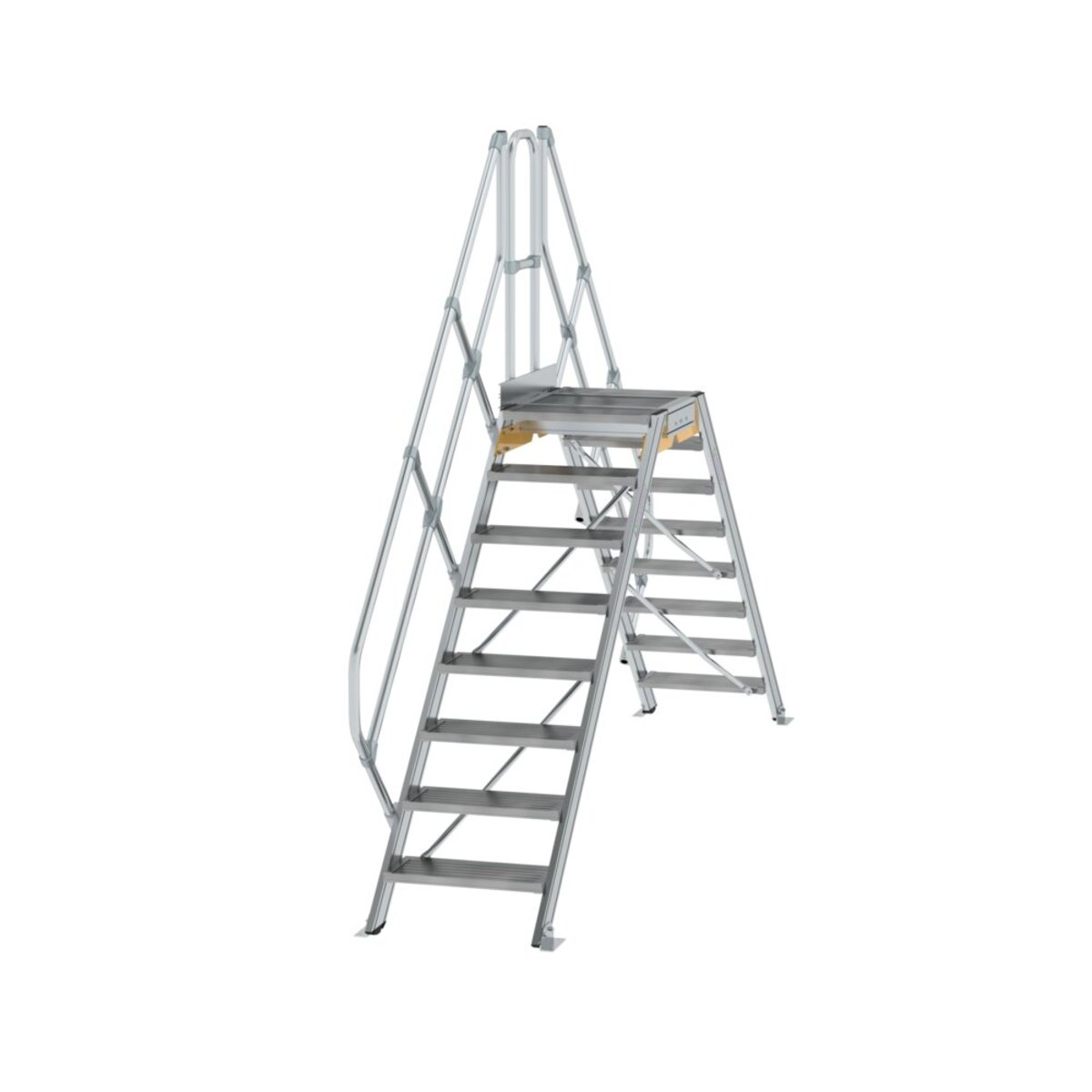 Ortsfester Überstieg aus Aluminium mit Neigung 45° Stufen- und Plattformbreite: 600 mm Plattformlänge: 460 mm Letzte Stufen (Tiefe: 225 mm) auf gleicher Höhe wie Plattform montiert (Gesamttrittfläche: 910 mm) Stufen- und Plattformausführung standardmäßig in Aluminium geriffelt (R 9), optional auch mit anderen Belägen erhältlich Handlauf und Geländer einseitig Ø 40 mm mit verschraubten Verbindungselementen (Höhe: 1.100 mm) serienmäßig Zweiter Handlauf optional (bei Wandabstand >120 mm nach DIN EN ISO 14122-3 erforderlich) Untere Holmenden mit robusten Fußwinkeln zur Bodenbefestigung Einfache Montage durch Lieferung in vormontierten Baugruppen inklusive Montageanleitung Maximale Belastung: 1,5 kN/m2, Stufenbelastung 150 kg, Gesamtbelastung 300 kg Hinweis: Im Standard sind Verbindungsteile aus verzinktem Stahl enthalten, welche für den Innenbereich geeignet sind. Gegen Mehrpreis können …