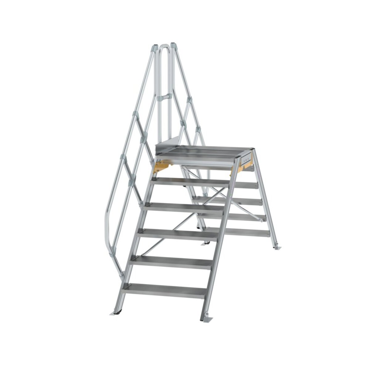 Ortsfester Überstieg aus Aluminium mit Neigung 45° Stufen- und Plattformbreite: 800 mm Plattformlänge: 460 mm Letzte Stufen (Tiefe: 225 mm) auf gleicher Höhe wie Plattform montiert (Gesamttrittfläche: 910 mm) Stufen- und Plattformausführung standardmäßig in Aluminium geriffelt (R 9), optional auch mit anderen Belägen erhältlich Handlauf und Geländer einseitig Ø 40 mm mit verschraubten Verbindungselementen (Höhe: 1.100 mm) serienmäßig Zweiter Handlauf optional (bei Wandabstand >120 mm nach DIN EN ISO 14122-3 erforderlich) Untere Holmenden mit robusten Fußwinkeln zur Bodenbefestigung Einfache Montage durch Lieferung in vormontierten Baugruppen inklusive Montageanleitung Maximale Belastung: 1,5 kN/m2, Stufenbelastung 150 kg, Gesamtbelastung 300 kg Hinweis: Im Standard sind Verbindungsteile aus verzinktem Stahl enthalten, welche für den Innenbereich geeignet sind. Gegen Mehrpreis können …