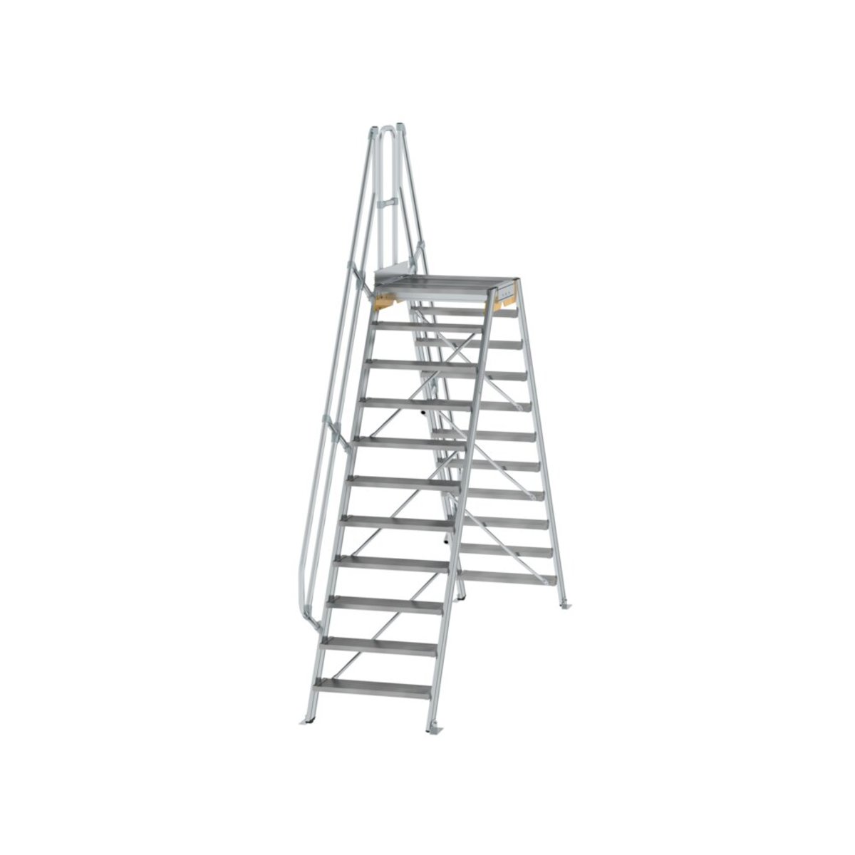 Ortsfester Überstieg aus Aluminium mit Neigung 60° Stufen- und Plattformbreite: 800 mm Plattformlänge: 460 mm Letzte Stufen (Tiefe: 225 mm) auf gleicher Höhe wie Plattform montiert (Gesamttrittfläche: 910 mm) Stufen- und Plattformausführung standardmäßig in Aluminium geriffelt (R 9), optional auch mit anderen Belägen erhältlich Handlauf und Geländer einseitig Ø 40 mm mit verschraubten Verbindungselementen (Höhe: 1.100 mm) serienmäßig Zweiter Handlauf nach DIN EN ISO 14122-3 erforderlich und gegen Mehrpreis erhältlich Untere Holmenden mit robusten Fußwinkeln zur Bodenbefestigung Einfache Montage durch Lieferung in vormontierten Baugruppen inklusive Montageanleitung Maximale Belastung: 1,5 kN/m2, Stufenbelastung 150 kg, Gesamtbelastung 300 kg Hinweis: Im Standard sind Verbindungsteile aus verzinktem Stahl enthalten, welche für den Innenbereich geeignet sind. Gegen Mehrpreis können dies…