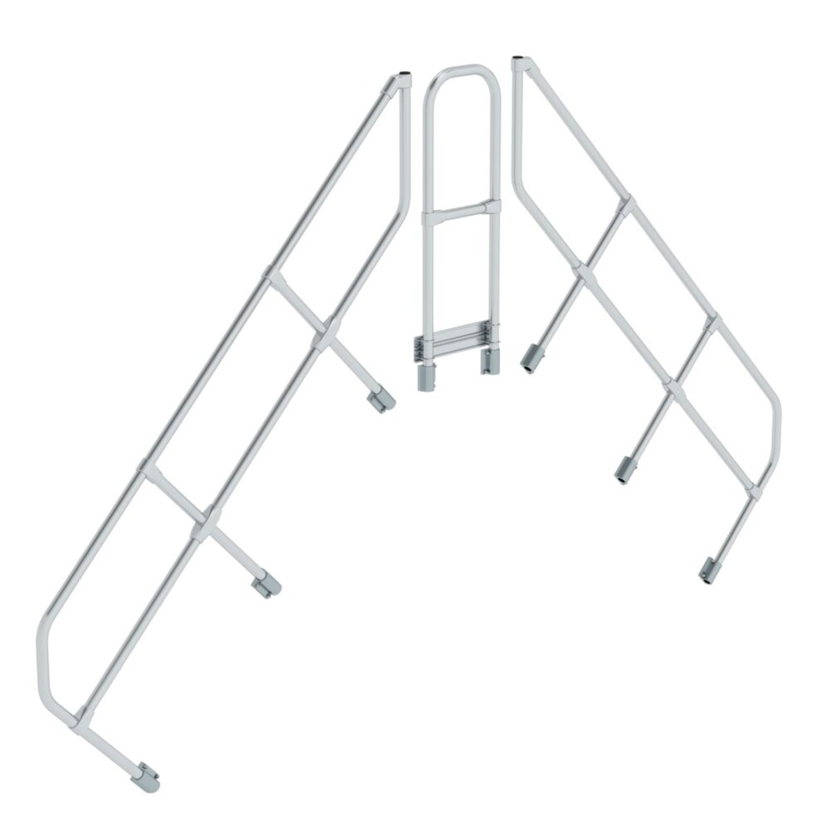 Ortsfester Überstieg aus Aluminium mit Neigung 45° Stufen- und Plattformbreiten: 600, 800 und 1.000 mm Stufentiefe: 225 mm Plattformlänge: 460 mm Letzte Stufen auf gleicher Höhe wie Plattform montiert Stufen- und Plattformausführung standardmäßig in Aluminium geriffelt (R 9), optional auch mit anderen Belägen erhältlich Handlauf und Geländer einseitig Ø 40 mm mit verschraubten Verbindungselementen (Höhe: 1.100 mm) serienmäßig Zweiter Handlauf optional (bei Wandabstand >120 mm nach DIN EN ISO 14122-3 erforderlich) Untere Holmenden mit robusten Fußwinkeln zur Bodenbefestigung Maximale Belastung: 1,5 kN/m2, Stufenbelastung 150 kg, Gesamtbelastung 300 kg Einfache Montage durch Lieferung in vormontierten Baugruppen inklusive Montageanleitung Hinweis: Im Standard sind Verbindungsteile aus verzinktem Stahl enthalten, welche für den Innenbereich geeignet sind. Gegen Mehrpreis können diese au…
