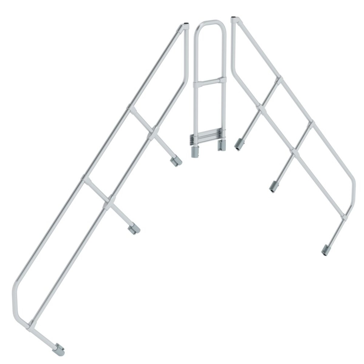 Ortsfester Überstieg aus Aluminium mit Neigung 45° Stufen- und Plattformbreiten: 600, 800 und 1.000 mm Stufentiefe: 225 mm Plattformlänge: 460 mm Letzte Stufen auf gleicher Höhe wie Plattform montiert Stufen- und Plattformausführung standardmäßig in Aluminium geriffelt (R 9), optional auch mit anderen Belägen erhältlich Handlauf und Geländer einseitig Ø 40 mm mit verschraubten Verbindungselementen (Höhe: 1.100 mm) serienmäßig Zweiter Handlauf optional (bei Wandabstand >120 mm nach DIN EN ISO 14122-3 erforderlich) Untere Holmenden mit robusten Fußwinkeln zur Bodenbefestigung Maximale Belastung: 1,5 kN/m2, Stufenbelastung 150 kg, Gesamtbelastung 300 kg Einfache Montage durch Lieferung in vormontierten Baugruppen inklusive Montageanleitung Hinweis: Im Standard sind Verbindungsteile aus verzinktem Stahl enthalten, welche für den Innenbereich geeignet sind. Gegen Mehrpreis können diese au…