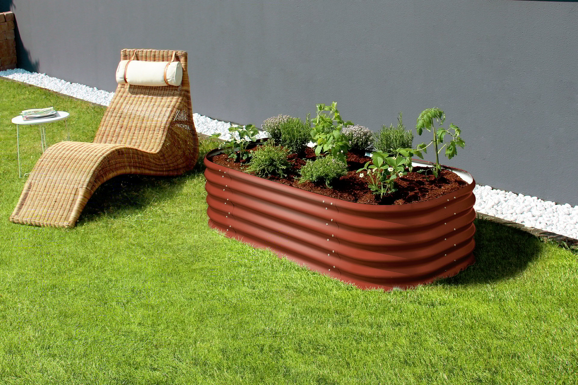 Hochbeet Terra Hochbeete dienen der Arbeitserleichterung bei der Aufzucht von Gemüse und Kräutern, weil durch sie das ständige Bücken bei der Gartenarbeit entfällt. Außerdem führen sie zu einer merklichen Ertragssteigerung, da die Durchscnittstemperatur im Hochbeet höher ist und optimale Bodenverhältnisse für die Pflanzen darin geschaffen werden können. Hergestellt aus dem extrem witterungsbeständigen Zincalume® benötigt das Hochbeet Terra im Gegensatz zu Holzbeeten keine Innenfolie: Es reagiert nicht mit organischen Materialien wie Erde und Pflanzen, wird also nicht dadurch beschädigt, gibt keine ungesunden Stoffe ab und verhält sich geschmacksneutral. Das Vitavia Hochbeet Terra besticht darüber hinaus durch moderner Optik und eine Vielzahl an Erweiterungsmöglichkeiten und Formgebungen: Die im Bausatz angelieferten einzelnen Module sind vorgebogen, die Verbindungsstücke vorgebohrt. Größe und Gestalt können mithilfe des Hochbeets Terra BASIC, der geraden Hochbeeterweiterung Terra STRETCHED und der gebogenen Erweiterung Terra CURVE frei kombiniert werden. Das Hochbeet Terra RUND ist die kleinste Variante und kann ebenfalls gut als dekorativer Pflanzkübel genutzt werden. Durch die frei kombinierbaren Module sind den Gestaltungsmöglichkeiten kaum Grenzen gesetzt. Zwischen die beiden runden Abschlusselemente und nach jeder Erweiterung Terra CURVE können können zwei gerade Bauelemente (Erweiterung Terra STRETCHED) aneinander gesetzt werden. So kann das Hochbeet auch optimal zur Abtrennung von Zonen im Garten oder als Sichtschutz eingesetzt werden. Die Hochbeete Terra RUND, Terra BASIC sowie die Erweiterung Terra STRETCHED sind in den Farben Blank, Rubin, Seegras, Granit, und Schwarz in drei verschiedenen Höhen erhältlich. In den Höhen von 40 und 63 cm sind die Hochbeete auch perfekt als Kinderbeet, Pflanzkübel, als Beet im Gewächshaus oder zur dekorativen Gartengestaltung einsetzbar. – Breite: 821, – Gewicht: 11,9, – Höhe: 401, – Länge: 1621