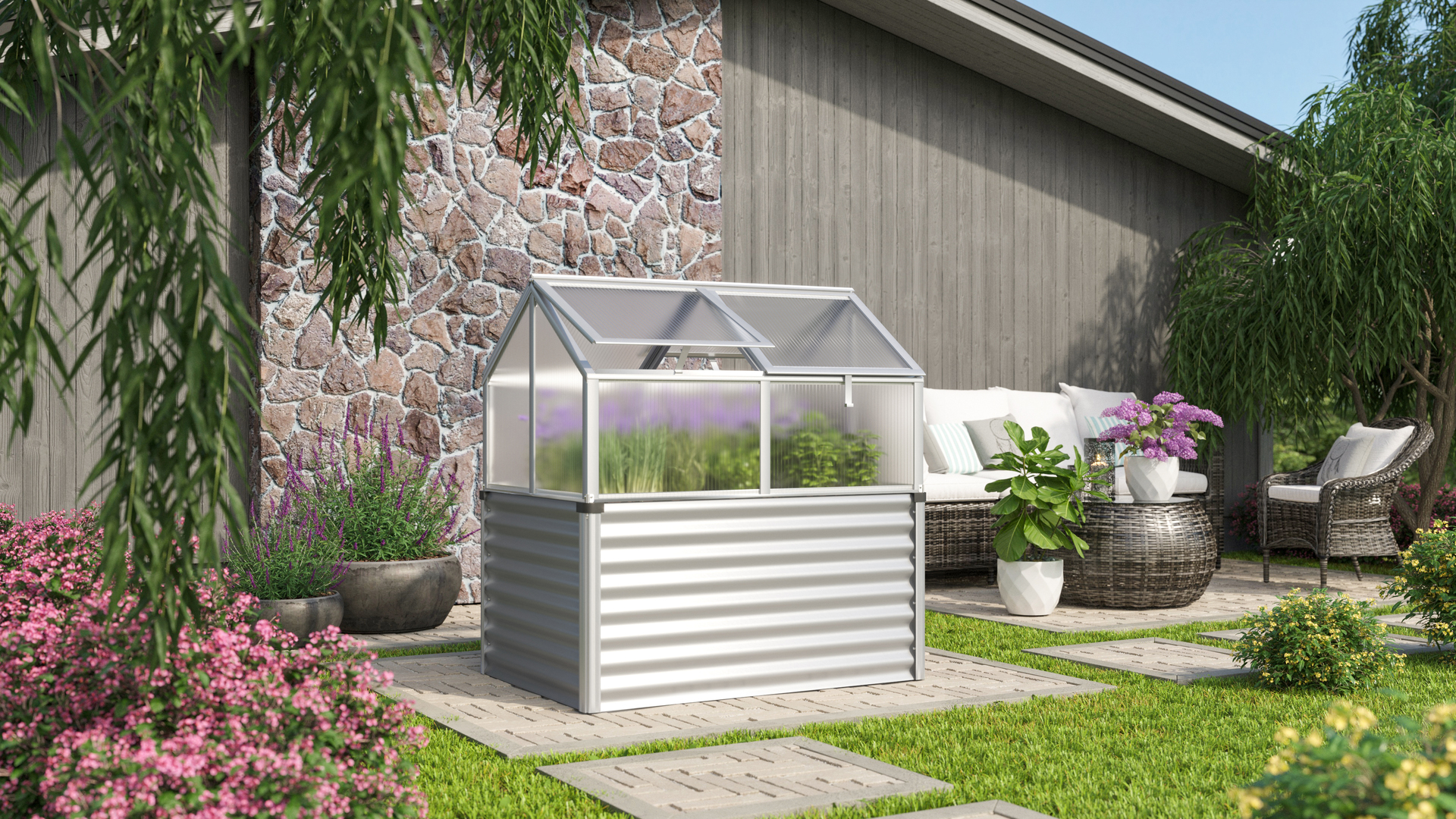 Hochfrühbeet Zola Ganz ähnlich seinem Namensgeber Èmile Zola, der in der Literatur und der Kunst die Realität mit dem Schönen zu vereinen wusste, verbindet das Frühbeet Zola die natürliche Welt der Pflanzen mit einem ästhetisch anspruchsvollen Ort. Dabei punktet es vor allem durch seine formschönen Profile aus dem widerstandsfähigen, kühl anmutenden Material Aluminium: Eben und glatt rahmen sie – je nach Verglasungsart – die UV-stabilisierten Hohlkammerplatten oder das kristallklare Sicherheitsglas ein und verleihen dem Frühbeet eine dezente und edle Erscheinung . Auch die Dachspitze ist abgerundet und vollendet so das hochwertige und ästhetische Gesamtbild des Frühbeetes, das in Stablität und Optik einem Mini-Gewächshaus näher kommt als einem üblichen Frühbeet. Gamma hat eine Firsthöhe von 71 cm, die Seiten sind 38 cm hoch. In Kombination mit dem langlebigen Zincalume-Unterbau wird das hochwertige Frühbeet zum Hochfrühbeet mit einer Gesamthöhe von 1,35 m. Neben der rückenfreundlichen Gartenarbeit an der Ernte von morgen erlaubt diese auch auch den Einsatz als stilvoller Sichtschutz im modernen Garten oder Vorgarten. – Breite: 890, – Gewicht: 27,56, – Höhe: 1345, – Länge: 1267