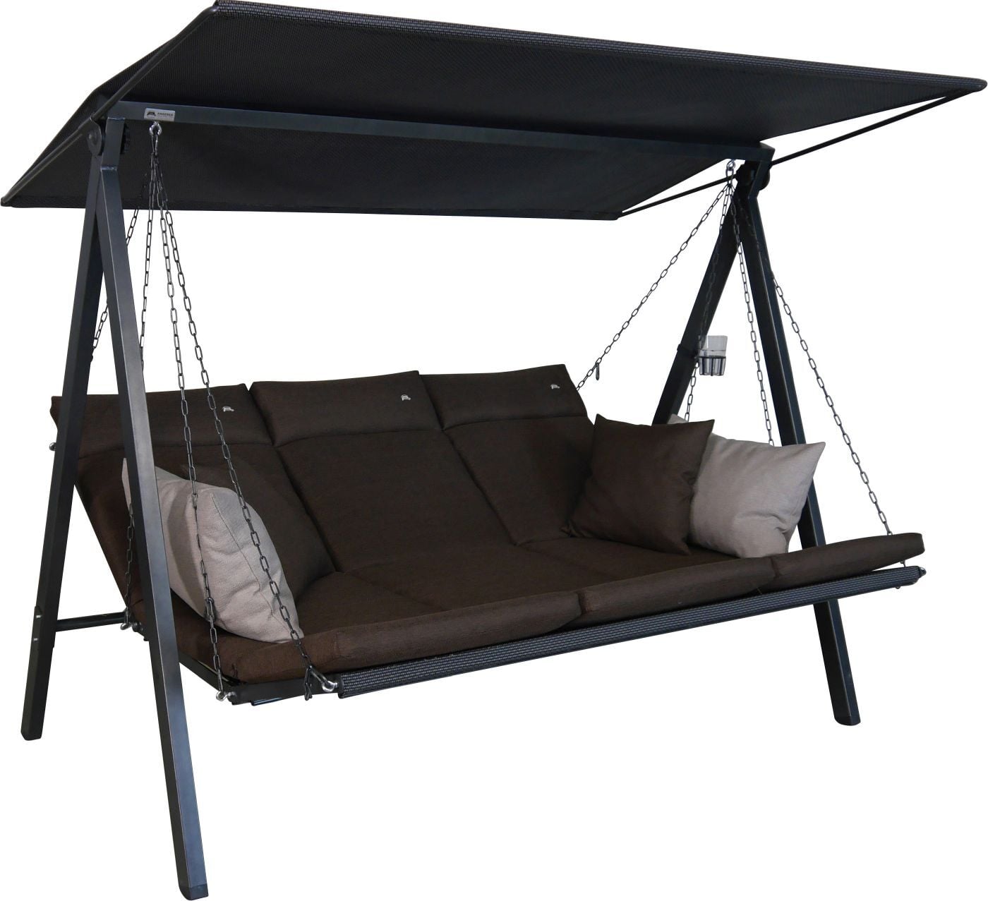 Hollywoodschaukel Lounge Die moderne 3-Sitzer Hollywoodschaukel Lounge ist ein echtes Designerstück und zählt zu den High-End Hollywoodschaukel Modellen der Firma Angerer. Die ergonomisch geformte Sitzfläche besteht aus robustem und dennoch leicht flexiblem Textilene Gewebe. Dank der Kettenaufhängung kann die Sitz- und Liegeposition individuell verstellt werden. Je nachdem, welche Position gewünscht ist, können die mitgelieferten Karabiner in jedes beliebige Kettenglied eingehängt werden. Neben der klassischen Sitzposition kann die Schaukelbank in eine Liegefläche oder in die U-förmigen Lounge-Position umgewandelt werden. Der Clou: trotz abgeklappter Lehne lässt es sich noch bequem Schaukeln. Jede der drei Sitzauflagen hat ein extra dick gepolstertes Kopfteil, das mit einer schönen Logo-Stickung verziert ist. Alle Kissenbezüge sind aus einem besonders weichen Stoff gefertigt und lassen sich dank der praktischen Reißverschlüsse einfach abnehmen und bei 30° C in der Maschine waschen. Vier Sofakissen sind ebenfalls im Lieferumgang enthalten. Das robuste Gestell der Hollywoodschaukel besteht aus verzinktem und pulverbeschichtetem Stahl. Das Sonnendach ist, genau wie die Sitzbespannung, aus wetterfestem Textilene Gewebe gefertigt und ebenfalls verstellbar. Durch Vor- oder Zurückschieben oder Neigen des Daches ist stets optimaler Sonnenschutz gegeben. Zur Selbstmontage, inkl. Montageanleitung. Made in Germany. In verschiedenen Designs erhältlich. In verschiedenen Designs erhältlich: – Design 1: Smart coffee – Design 2: Smart denim – Design 3: Smart granit – Design 4: Smart lime – Design 5: Smart olive – Design 6: Smart sand – Design 7: Smart stone – Design 8: Zip anthrazit – Design 9: Zip granit – Breite: 128, – Gewicht: 83, – Höhe: 13, – Länge: 212, – Standfläche: ca. 210 x 145 cm