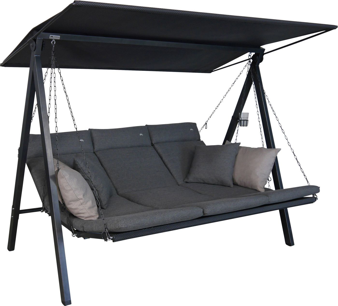 Die moderne 3-Sitzer Hollywoodschaukel Lounge ist ein echtes Designerstück und zählt zu den High-End Hollywoodschaukel Modellen der Firma Angerer. Die ergonomisch geformte Sitzfläche besteht aus robustem und dennoch leicht flexiblem Textilene Gewebe. Dank der Kettenaufhängung kann die Sitz- und Liegeposition individuell verstellt werden. Je nachdem, welche Position gewünscht ist, können die mitgelieferten Karabiner in jedes beliebige Kettenglied eingehängt werden. Neben der klassischen Sitzposition kann die Schaukelbank in eine Liegefläche oder in die U-förmigen Lounge-Position umgewandelt werden. Der Clou: trotz abgeklappter Lehne lässt es sich noch bequem Schaukeln. Jede der drei Sitzauflagen hat ein extra dick gepolstertes Kopfteil, das mit einer schönen Logo-Stickung verziert ist. Alle Kissenbezüge sind aus einem besonders weichen Stoff gefertigt und lassen sich dank der praktischen Reißverschlüsse einfach abnehmen und bei 30° C in der Maschine waschen. Vier Sofakissen sind ebenfalls im Lieferumgang enthalten. Das robuste Gestell der Hollywoodschaukel besteht aus verzinktem und pulverbeschichtetem Stahl. Das Sonnendach ist, genau wie die Sitzbespannung, aus wetterfestem Textilene Gewebe gefertigt und ebenfalls verstellbar. Durch Vor- oder Zurückschieben oder Neigen des Daches ist stets optimaler Sonnenschutz gegeben. Zur Selbstmontage, inkl. Montageanleitung. Made in Germany. In verschiedenen Designs erhältlich.