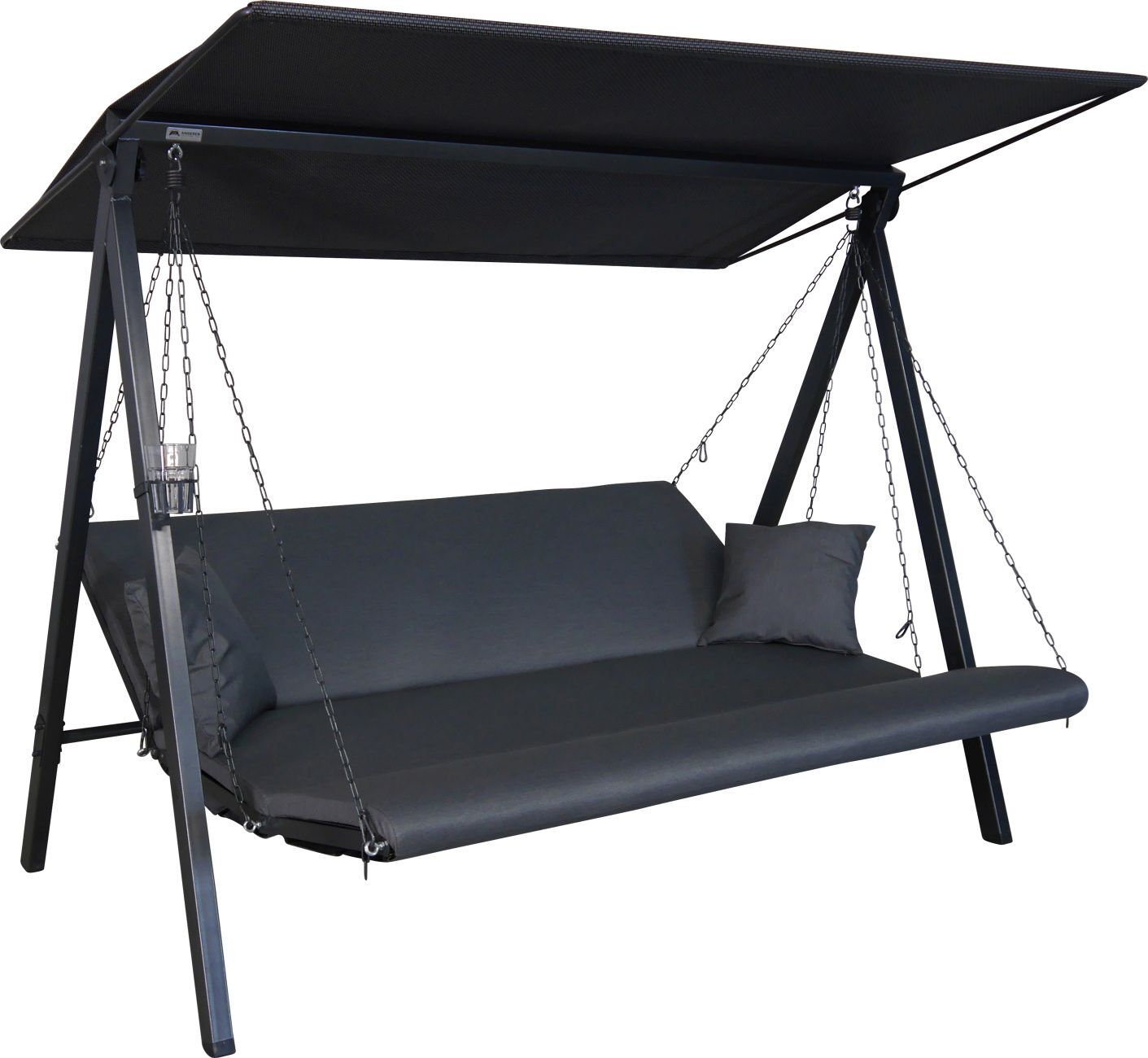 Die moderne 3-Sitzer Hollywoodschaukel Lounge ist ein echtes Designerstück und zählt zu den High-End Hollywoodschaukel Modellen der Firma Angerer. Die ergonomisch geformte Sitzfläche besteht aus robustem und dennoch leicht flexiblem Textilene Gewebe. Dank der Kettenaufhängung kann die Sitz- und Liegeposition individuell verstellt werden. Je nachdem, welche Position gewünscht ist, können die mitgelieferten Karabiner in jedes beliebige Kettenglied eingehängt werden. Neben der klassischen Sitzposition kann die Schaukelbank in eine Liegefläche oder in die U-förmigen Lounge-Position umgewandelt werden. Der Clou: trotz abgeklappter Lehne lässt es sich noch bequem Schaukeln. Jede der drei Sitzauflagen hat ein extra dick gepolstertes Kopfteil, das mit einer schönen Logo-Stickung verziert ist. Alle Kissenbezüge sind aus einem besonders weichen Stoff gefertigt und lassen sich dank der praktischen Reißverschlüsse einfach abnehmen und bei 30° C in der Maschine waschen. Vier Sofakissen sind ebenfalls im Lieferumgang enthalten. Das robuste Gestell der Hollywoodschaukel besteht aus verzinktem und pulverbeschichtetem Stahl. Das Sonnendach ist, genau wie die Sitzbespannung, aus wetterfestem Textilene Gewebe gefertigt und ebenfalls verstellbar. Durch Vor- oder Zurückschieben oder Neigen des Daches ist stets optimaler Sonnenschutz gegeben. Zur Selbstmontage, inkl. Montageanleitung. Made in Germany. In verschiedenen Designs erhältlich.