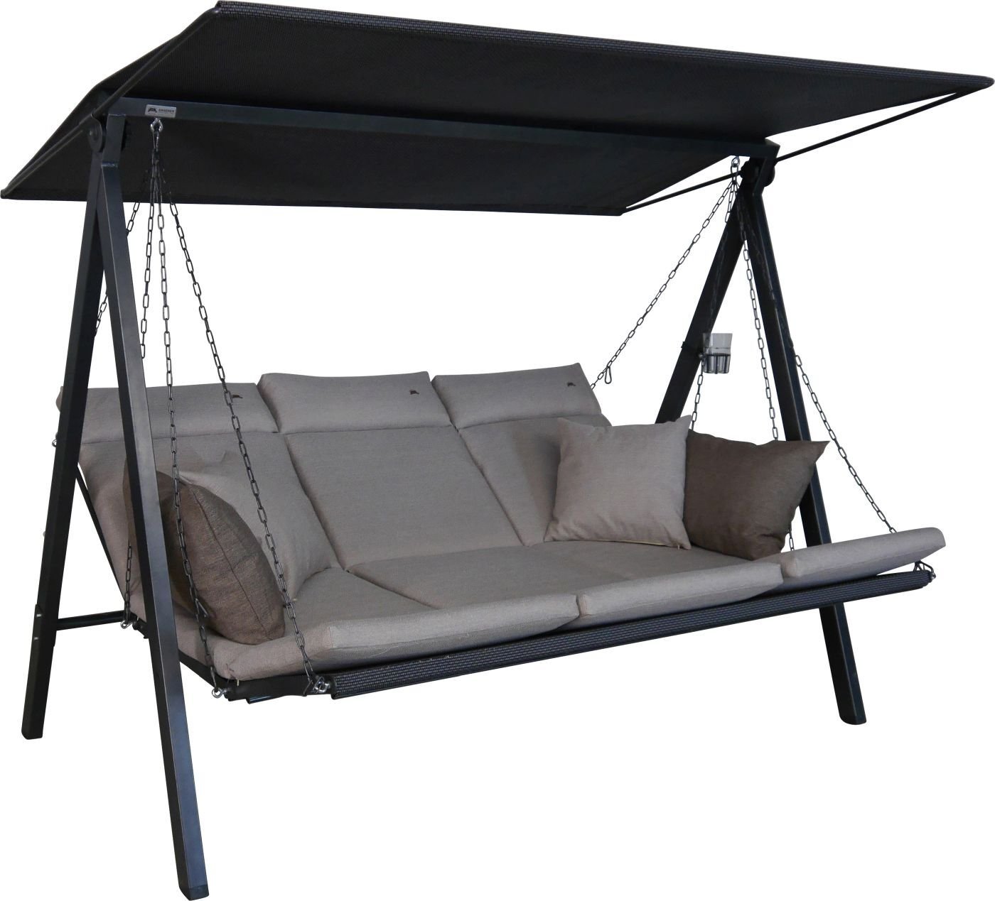 Hollywoodschaukel Lounge Die moderne 3-Sitzer Hollywoodschaukel Lounge ist ein echtes Designerstück und zählt zu den High-End Hollywoodschaukel Modellen der Firma Angerer. Die ergonomisch geformte Sitzfläche besteht aus robustem und dennoch leicht flexiblem Textilene Gewebe. Dank der Kettenaufhängung kann die Sitz- und Liegeposition individuell verstellt werden. Je nachdem, welche Position gewünscht ist, können die mitgelieferten Karabiner in jedes beliebige Kettenglied eingehängt werden. Neben der klassischen Sitzposition kann die Schaukelbank in eine Liegefläche oder in die U-förmigen Lounge-Position umgewandelt werden. Der Clou: trotz abgeklappter Lehne lässt es sich noch bequem Schaukeln. Jede der drei Sitzauflagen hat ein extra dick gepolstertes Kopfteil, das mit einer schönen Logo-Stickung verziert ist. Alle Kissenbezüge sind aus einem besonders weichen Stoff gefertigt und lassen sich dank der praktischen Reißverschlüsse einfach abnehmen und bei 30° C in der Maschine waschen. Vier Sofakissen sind ebenfalls im Lieferumgang enthalten. Das robuste Gestell der Hollywoodschaukel besteht aus verzinktem und pulverbeschichtetem Stahl. Das Sonnendach ist, genau wie die Sitzbespannung, aus wetterfestem Textilene Gewebe gefertigt und ebenfalls verstellbar. Durch Vor- oder Zurückschieben oder Neigen des Daches ist stets optimaler Sonnenschutz gegeben. Zur Selbstmontage, inkl. Montageanleitung. Made in Germany. In verschiedenen Designs erhältlich. In verschiedenen Designs erhältlich: – Design 1: Smart coffee – Design 2: Smart denim – Design 3: Smart granit – Design 4: Smart lime – Design 5: Smart olive – Design 6: Smart sand – Design 7: Smart stone – Design 8: Zip anthrazit – Design 9: Zip granit – Breite: 128, – Gewicht: 83, – Höhe: 13, – Länge: 212, – Standfläche: ca. 210 x 145 cm