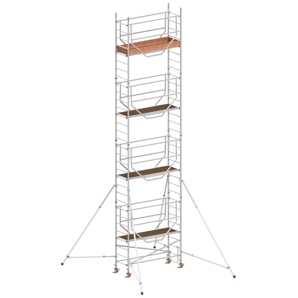 Hymer Fahrgerüst ADVANCED SAFE-T 7075, Modul 1+2+3+4, Bühnenlänge 2,08 m, Rahmenteilbreite 0,72 m, Reichhöhe 9,27 m∙ Ideal geeignet für Dach- und Fassadenarbeiten mit besonders sicherem Aufbau.∙ Schneller Auf- und Abbau durch praktische Klickverschlüsse an Streben und Diagonalen.∙ Robuste Ausführung durch massive, geschweißte Rahmenteile.∙ Sehr geräumige Bühne (2,08×0,61 m), wetterfest und rutschsicher.∙ Gesicherter Stand in jeder Phase des Aufbaus durch Sicherheitsgeländer, das bereits von unten eingehängt wird.∙ Inkl. 4 höhenverstellbarer Lenkrollen (Ø 150 mm) für den Ausgleich von Bodenunebenheiten.∙ Inkl. teleskopierbarer Ausleger mit Bajonett-Verschluss zur bequemen Montage vom Boden aus und zum Ausgleich von Bodenunebenheiten.