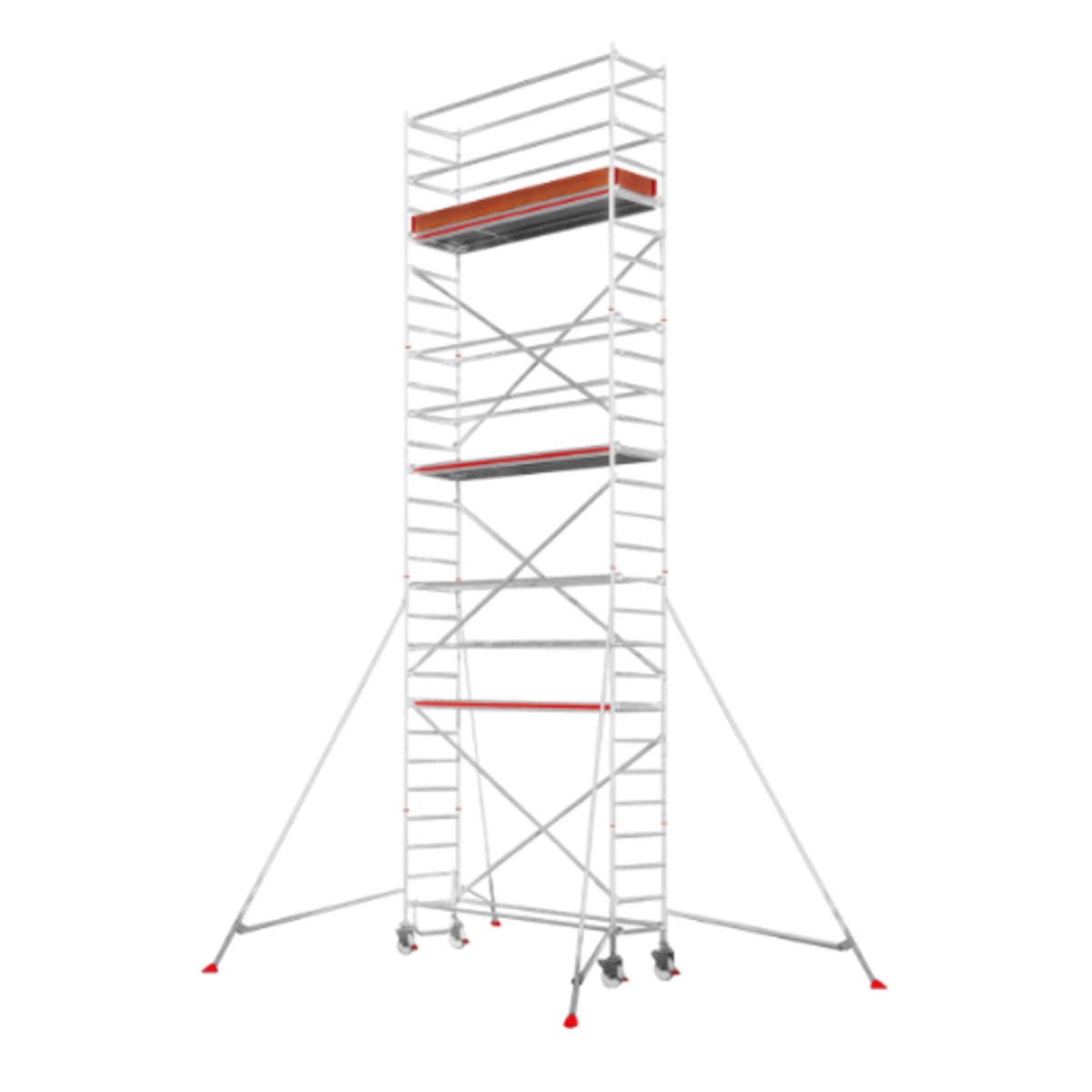 Fahrgerüst mit Ausleger, Bühnenlänge 1,90 m, Rahmenteilbreite 0,80 m, Reichhöhe 7,25 m∙ Ideal geeignet für Dach- und Fassadenarbeiten.∙ Extrem robuste Ausführung durch massive, geschweißte Rahmenteile.∙ Schneller Auf- und Abbau durch massive Klickverschlüsse an Streben und Diagonalen und Verwendung einer Bühne je Etage.∙ Inkl. HYMER-Lifter, mit dem sich Diagonalen und Verstrebungen schnell und sicher von unten ein- und aushängen lassen. ∙ Sehr geräumige Bühne (1,90×0,65 m), wetterfest und rutschsicher.∙ Inkl. 4 höhenverstellbarer Lenkrollen (Ø 150 mm) für den Ausgleich von Bodenunebenheiten.∙ Inkl. teleskopierbarer Ausleger mit Bajonett-Verschluss zur bequemen Montage vom Boden aus.∙ Aufbau mit Höhenversatz möglich.
