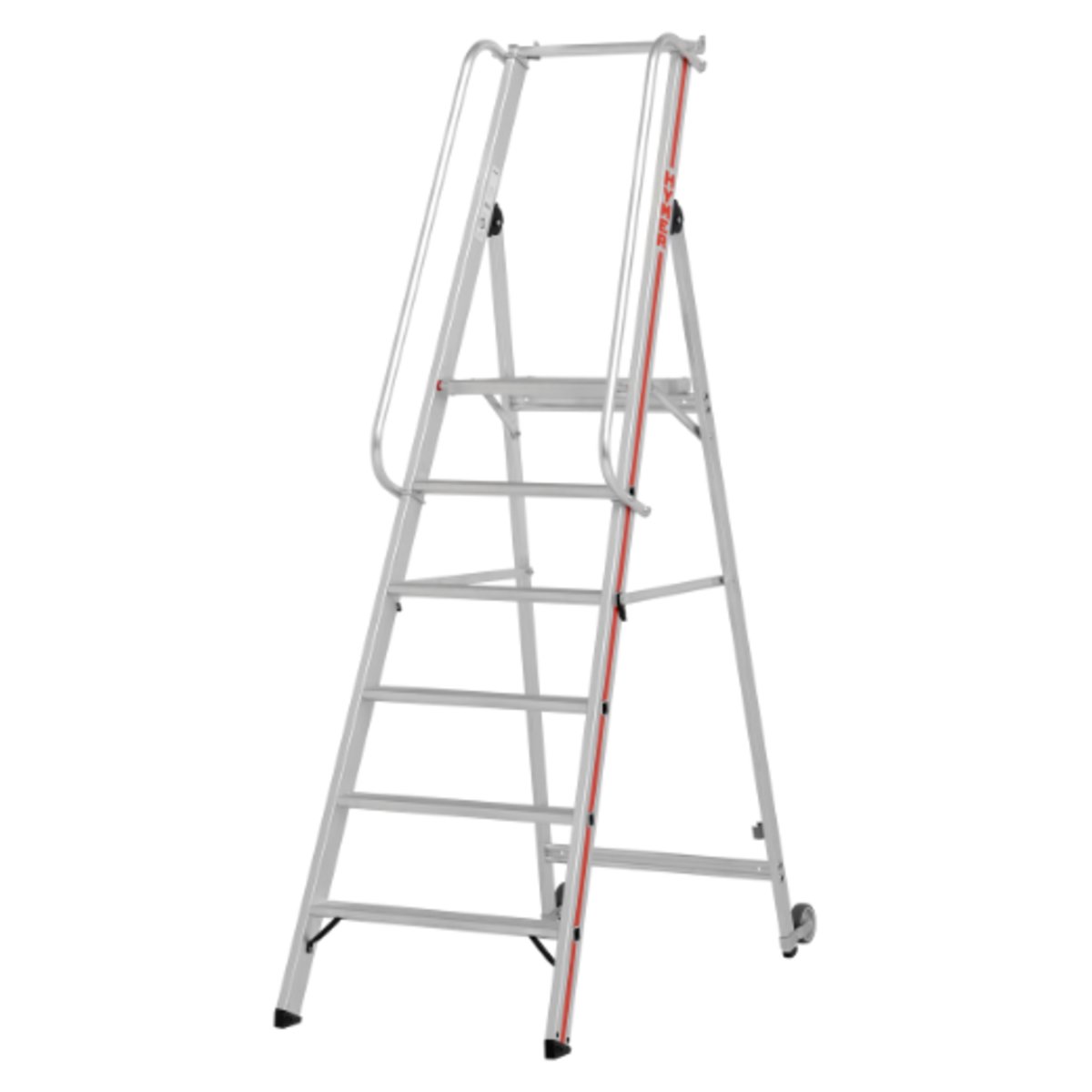 Plattformleiter mit Kipprollen und langem Handlauf, 6 Stufen, Plattformhöhe 1,40 m● Stufentiefe 80 mm.● Plattformabmessung 440×400 mm.● Geländerhöhe über Plattform 800 mm.● Ausgestattet mit Rollen am Stützteil, 100 mm Durchmesser.● Leichtes Verschieben durch Anheben am Leiterteil.● Speziell für Einsatzbereiche, die eine Verwendung von Podestleitern mit breitem Fahrwerk nicht zulassen oder das dichte Heranfahren an Regale erfordern.● Große Ablageschale für Werkzeug und Kleinteile, 450 mm breit, sowie Einhängehaken für Eimer und Kleingeräte.● Serienmäßig angebrachte, starre Streben für hohe Standsicherheit.● Stabile Aussteifungsstreben am Antritt.● Die Lieferung des Handlaufes und der Rollen erfolgt unmontiert, jedoch zur Selbstmontage vorbereitet.