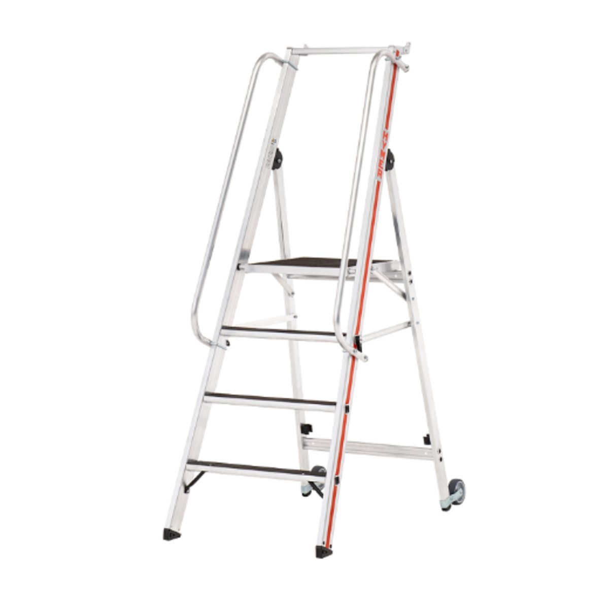 Plattformleiter R13 mit Kipprollen und langem Handlauf, 4 Stufen, Standhöhe 0,95 m· Arbeitssicherheit in der höchsten Rutschhemmungsklasse R13. Geeignet für den Einsatz in öligen Bereichen.· Bequemer und sicherer Stand bei längeren Arbeiten dank großflächiger Plattform.· Ergonomisches Arbeiten auf 80 mm Stufentiefe. Vorderkante mit Holm bündig.· Massive Ablageschale aus Aluminium mit Eimerhaken.· Aushängbare, starre Streben verhindern unbeabsichtigtes Zusammenklappen.· Ergonomisch geformte, beidseitige Handläufe.· Stabiler Stand der Leiter durch konische Ausführung.Merkmale:· R13-Beschichtung auf der gesamten Trittfläche.· Plattformabmessung 440 x 400 mm.· Geländerhöhe (über Plattform) 800 mm.· Nach EN 131.