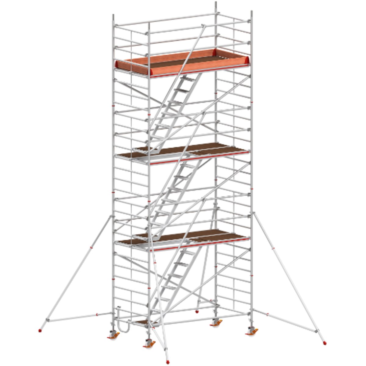 Treppen-Fahrgerüst mit Ausleger, Bühnenlänge 2,95 m, Rahmenteilbreite 1,50 m, Reichhöhe 8,40 m∙ Besonders geeignet für Arbeiten an großen Deckenflächen.∙ Schneller Auf- und Abbau durch massive Klickverschlüsse an Streben und Diagonalen und noch sicherer durch die in jeder Etage eingehängten Treppen.∙ Extrem robuste Ausführung durch massive, geschweißte Rahmenteile.∙ Sicherer und bequemer Auf- und Abstieg durch 55° Treppenneigung, selbst mit Werkzeug oder Baumaterial.∙ Maximale Standsicherheit durch 1,50 m breite Rahmenteile.∙ Stufentiefe 150 mm.∙ Doppelt so geräumig durch zwei nebeneinander liegende Bühnen (2,95×1,30 m) als oberste Plattform.∙ Inkl. 4 höhenverstellbarer Lenkrollen (Ø 200 mm) für den Ausgleich von Bodenunebenheiten.∙ Aufbau mit Höhenversatz möglich.