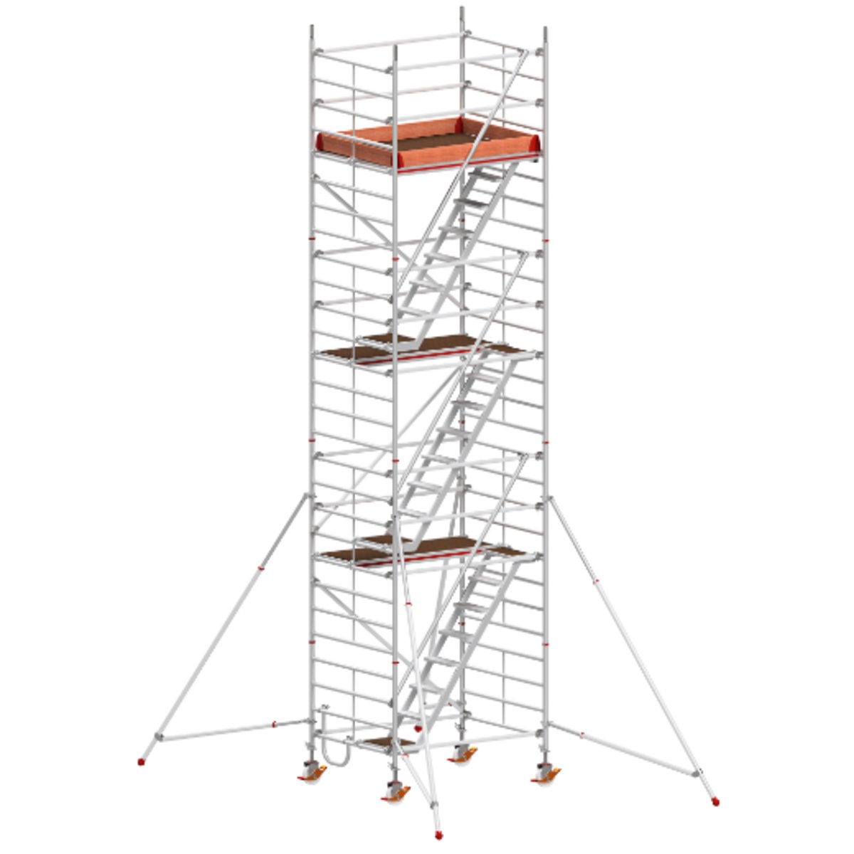 Treppen-Fahrgerüst mit Ausleger, Bühnenlänge 1,90 m, Rahmenteilbreite 1,50 m, Reichhöhe 10,40 m∙ Besonders geeignet für Arbeiten an großen Deckenflächen.∙ Schneller Auf- und Abbau durch massive Klickverschlüsse an Streben und Diagonalen und noch sicherer durch die in jeder Etage eingehängten Treppen.∙ Extrem robuste Ausführung durch massive, geschweißte Rahmenteile.∙ Sicherer und bequemer Auf- und Abstieg durch 55° Treppenneigung, selbst mit Werkzeug oder Baumaterial.∙ Maximale Standsicherheit durch 1,50 m breite Rahmenteile.∙ Stufentiefe 150 mm.∙ Doppelt so geräumig durch zwei nebeneinander liegende Bühnen (1,90×1,30 m) als oberste Plattform.∙ Inkl. 4 höhenverstellbarer Lenkrollen (Ø 200 mm) für den Ausgleich von Bodenunebenheiten.∙ Aufbau mit Höhenversatz möglich.