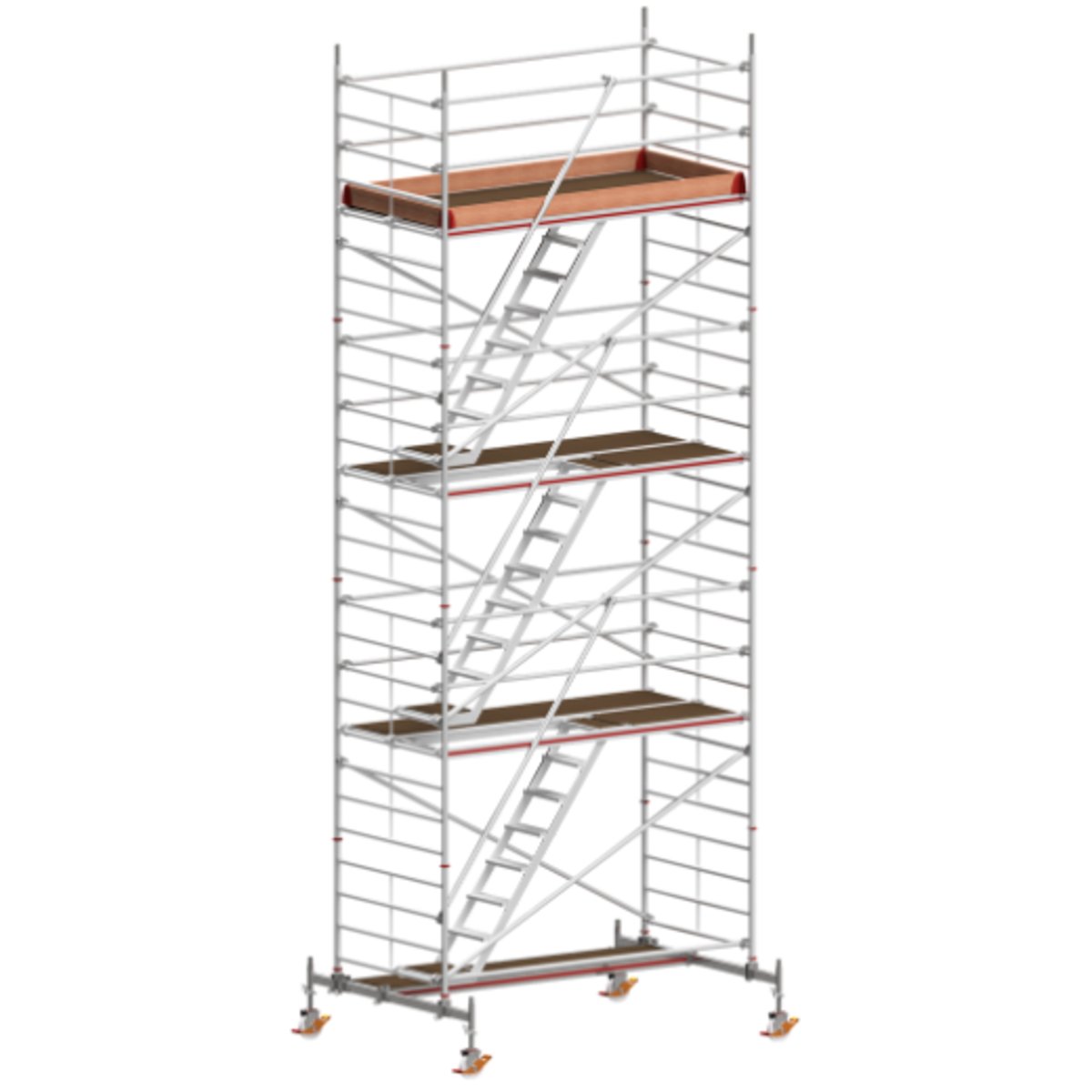 Treppen-Fahrgerüst mit Fahrtraverse, Bühnenlänge 2,95 m, Rahmenteilbreite 1,50 m, Reichhöhe 6,60 m∙ Besonders geeignet für Arbeiten an großen Deckenflächen.∙ Schneller Auf- und Abbau durch massive Klickverschlüsse an Streben und Diagonalen und noch sicherer durch die in jeder Etage eingehängten Treppen.∙ Extrem robuste Ausführung durch massive, geschweißte Rahmenteile.∙ Sicherer und bequemer Auf- und Abstieg durch 55° Treppenneigung, selbst mit Werkzeug oder Baumaterial.∙ Maximale Standsicherheit durch 1,50 m breite Rahmenteile.∙ Stufentiefe 150 mm.∙ Doppelt so geräumig durch zwei nebeneinander liegende Bühnen (2,95×1,30 m) als oberste Plattform.∙ Inkl. 4 höhenverstellbarer Lenkrollen (Ø 200 mm) für den Ausgleich von Bodenunebenheiten.∙ Arbeiten an der Wand durch seitliches Versetzen auf der Traverse möglich.