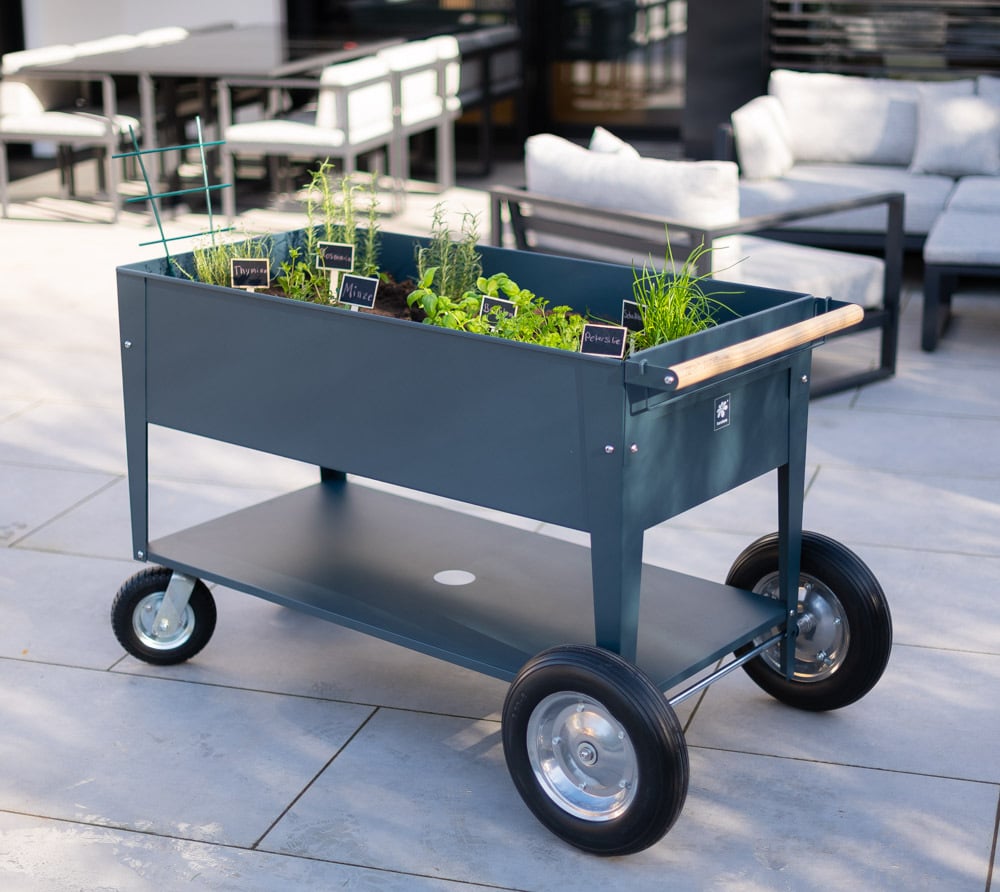 Kräuterfabrik Swivel Herstera Garden Kräuterfabrik Swivel Anthrazit Das Allround-Talent für Ihre Pflanzen ! Der Herstera Garden verbindet modernes Design mit rückenschonendem Gärtnern in angenehmer Stehhöhe. Bei der bunten Auswahl verschiedenster Farben findet jeder das Passende für seinen Geschmack. Aus pulverbeschichtetem Stahl für enorme Lebensdauer und abgerundeten Kanten für hohe Sicherheit hergestellt. Rostfrei, witterungs- und frostbeständig für den ganzjährigen Gebrauch zur Aufzucht von Gemüse und Kräutern oder einfach als dekorativer Pflanzkasten geeignet. Die spezielle Bodenform ermöglicht das Ansammeln und Ablassen (Gummiabdichtung) von überschüssigem Wasser. Für einen einfachen Transport garantiert die Bereifung Ihres Hochbeetes. Durch die ansprechende Optik bietet die innovative Kräuterfabrik Swivel vom spanischen Hersteller Hestera Garden viel Freiraum für vielfältige Design-Ideen. Zerlegt in nur einer Box zur Selbstmontage geliefert. Mit nur wenigen Handgriffen auf- bzw. wieder abbaubar. – Breite: 60, – Gewicht: 23, – Höhe: 80, – Länge: 120, – Material: Stahl