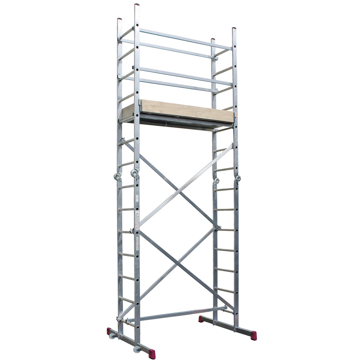 Vielseitig verwendbares Gerüst. Als ArbeitsGerüst mit einer Arbeitshöhe von ca. 4,85 m, als 2 separate AnlegeLeitern mit 14 Sprossen und einer Sprossen-DoppelLeiter 2×7 Sprossen.- Rutschsichere und wetterfeste Belagbühne Belagbühnengröße 1,50 m x 0,56 m- Durch 2 integrierte Fahrrollen auch als Fahr-Gerüst verwendbar – Zwei breite Quertraversen sorgen für Standsicherheit – Große Zeitersparnis bei der Montage durch den Einsatz von vier innovativen Gelenken an den Leiternelementen- Das Gerüst kann auf Treppen und Absätzen eingesetzt werden- Inklusive zwei Wandabstandhalter – dadurch Aufbau an Außenwänden ohne zusätzliche Ballastierung möglich- Ballastaufnahmen (Ballastgewichte als Zubehör erhältlich) sind im Paket enthalten- Belagbühne belastbar 150kg pro Quadratmeter, gemäß EN 1004- TÜV/GS-geprüft