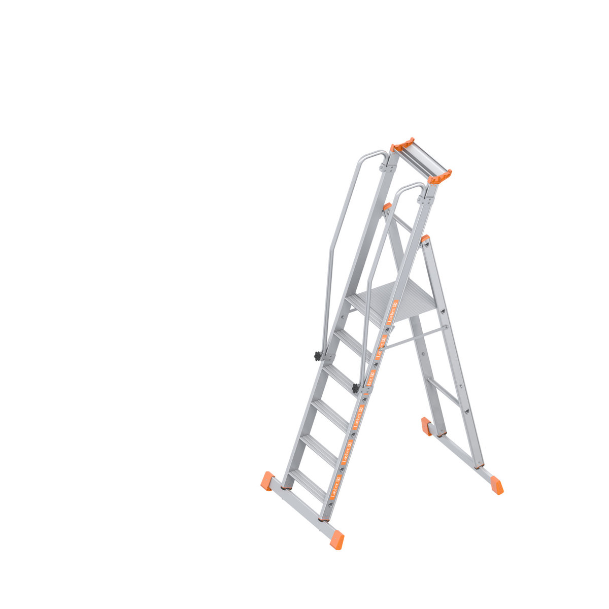 Layher Plattformleiter TOPIC mit beidseitigen Traversen – 6 StufenAluminiumleitern von Layher stehen für Robustheit und Langlebigkeit bei geringem Gewicht und finden Anwendung in allen Gewerken. Die Stufen sind gefertigt aus hochfesten, geschlossenen Strangprofilen ohne Längsschweißnaht mit hoher Beanspruchbarkeit. Sie sind in den Holm 4-fach verpresst. Für ein hohes Maß an Trittsicherheit sorgt die strak geriffelte Trittfläche der Stufen. Zusätzliche Aussteifer am Holmende sorgen für ein Übertreffen der Werte der DIN EN 131.Groß dimensionierte Palttform (480×420 mm) für komfortables und ermüdungsfreies Arbeiten – auch bei länger andauernden ArbeitenBeidseitig am Holm montierte Handläufe für sicheren Halt beim Auf-und Absteigen. Zum Transport sind diese einklappbarAblageschale aus Aluminium zur Ablage von Material und Werkzeug.Beidseitige Traverse als Basisverbreiterung für eine erhöh…